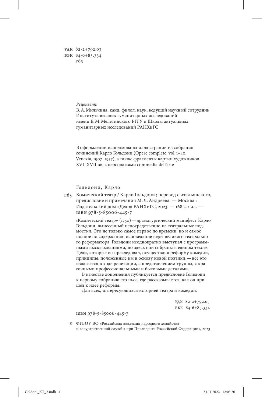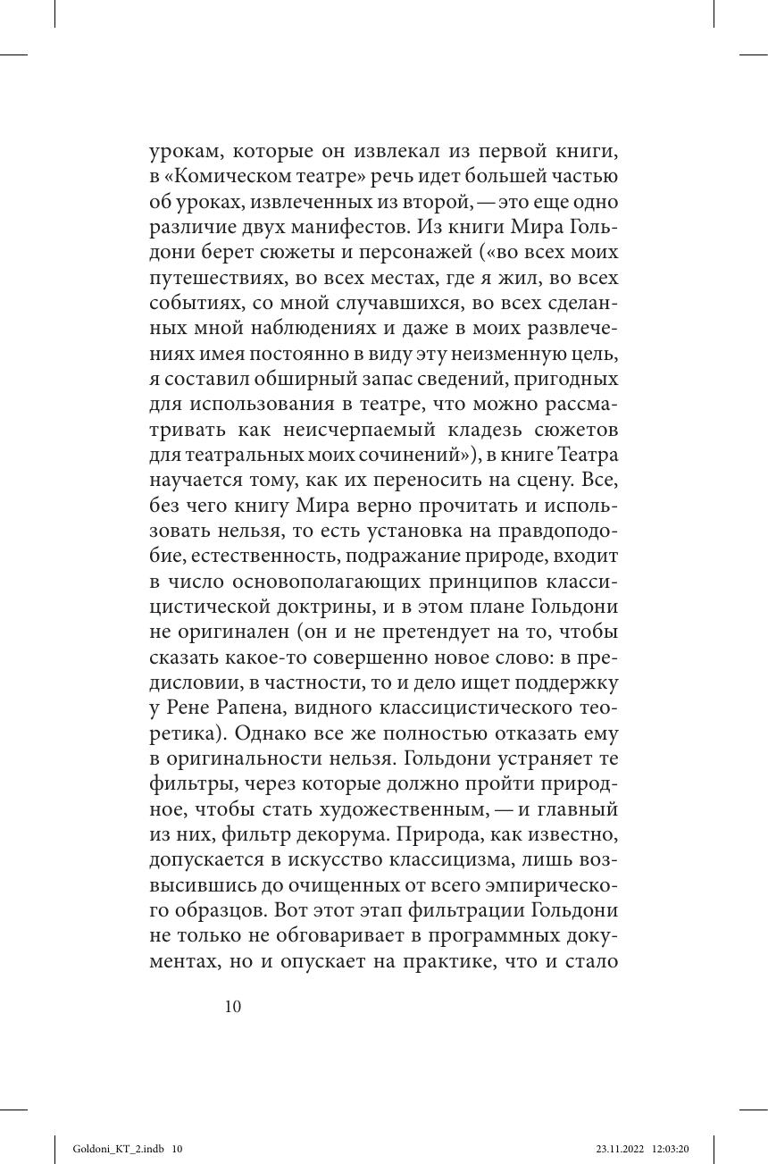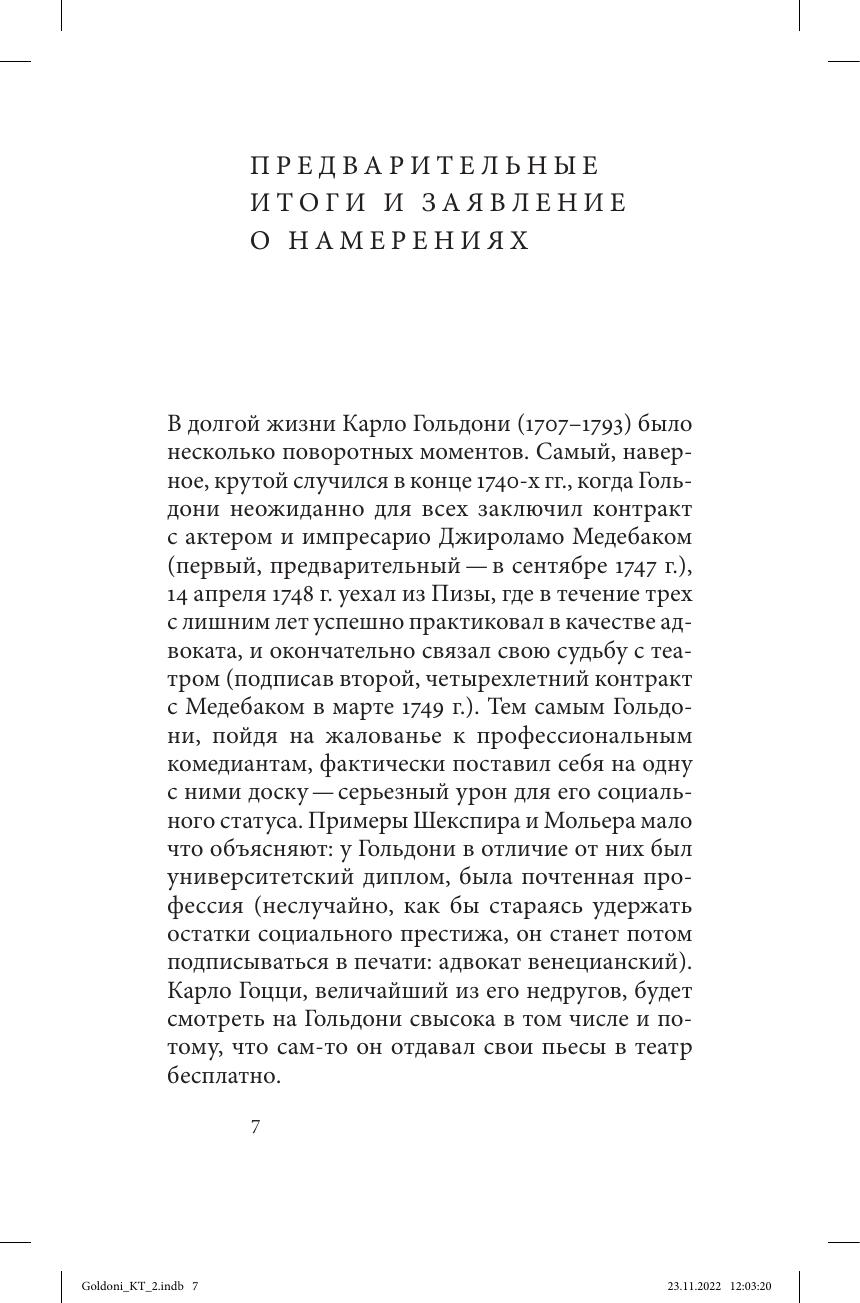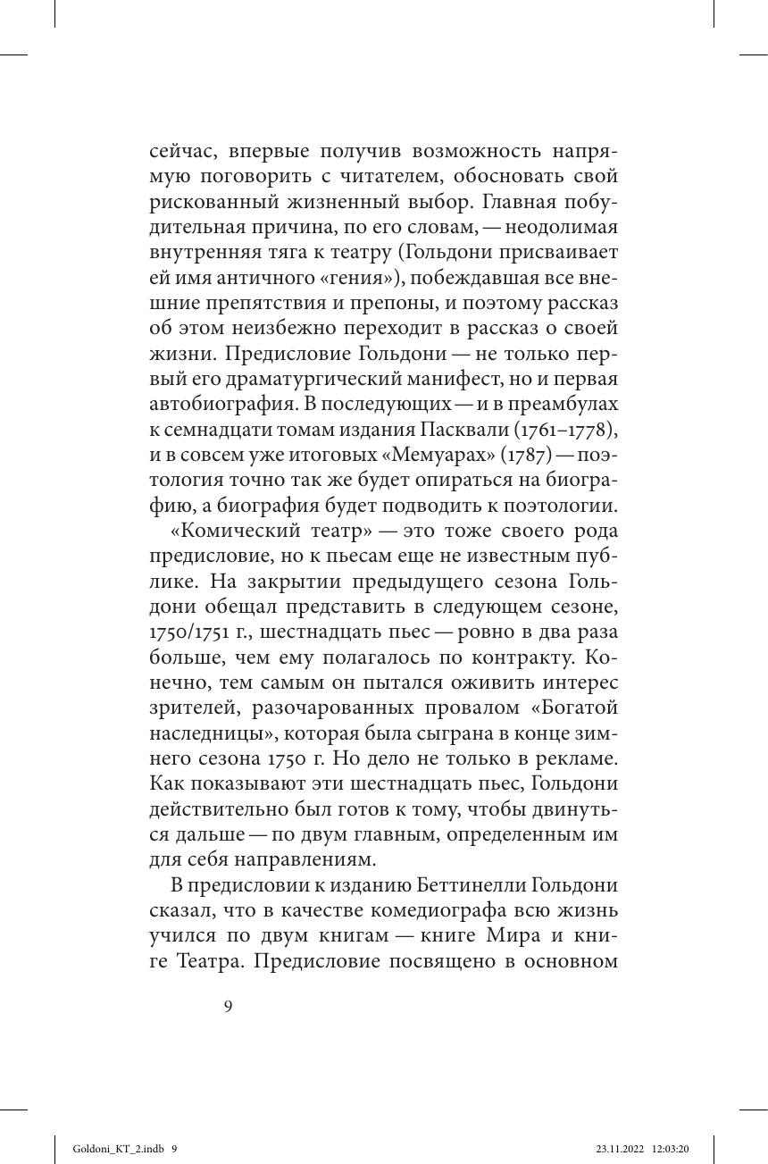 Комический театр» (1750) — драматургический манифест Карло Гольдони, вынесенный непосредственно на театральные подмостки. Это не только самое первое по времени, но и самое полное по содержанию исповедание веры великого театрально-го реформатора: Гольдони неоднократно выступал с программными высказываниями, но здесь они собраны в едином тексте. Цели, которые он преследовал, осуществляя реформу комедии, принципы, положенные им в основу новой поэтики, — все это излагается в ходе репетиции, с представлением труппы, с красочными профессиональными и бытовыми деталями. В качестве дополнения публикуется предисловие Гольдони к первому собранию его пьес, где рассказывается, как он пришел к идее реформы.