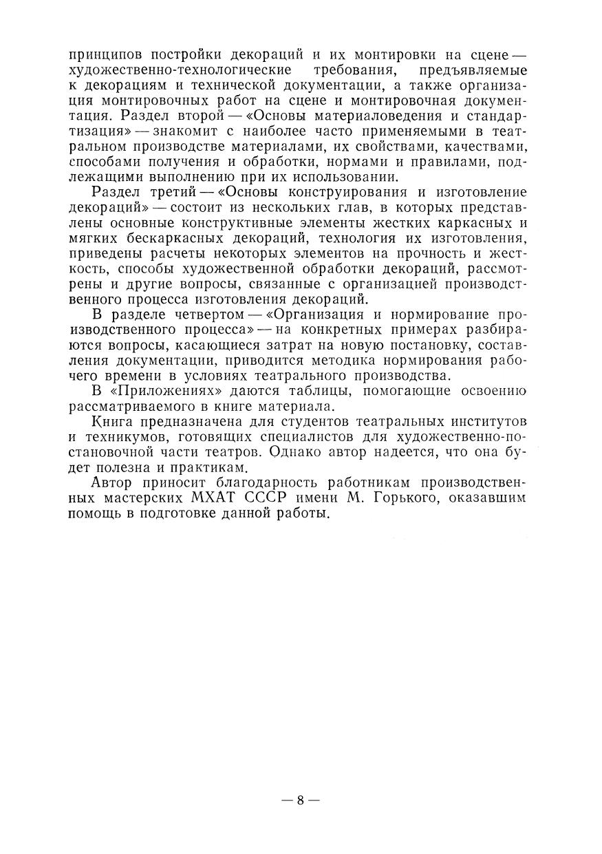 В книге подробно и последовательно освещены принципы изготовления основных деталей театральных декораций. Автор выстраивает материал, идя от общих задач по созданию внешней формы спектакля к конкретному их воплощению. Особый интерес представляют технические рисунки, позволяющие наглядно увидеть конструкцию того или иного элемента декорации. Рассчитан на студентов специальных учебных заведений, а также на специалистов — заведующих постановочной частью театра. The book describes in detail and consistently the principles of making the main parts of theatrical scenery. The author builds the material, going from the general tasks of creating the external form of the performance to their specific embodiment. Of particular interest are technical drawings that allow you to clearly see the design of one or another decoration element. The manual is intended for students of special educational institutions, as well as for specialists — heads of the theater production section.