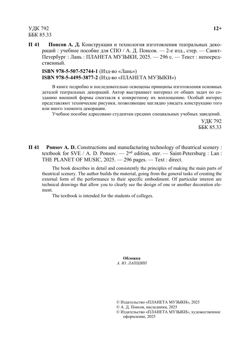 В книге подробно и последовательно освещены принципы изготовления основных деталей театральных декораций. Автор выстраивает материал от общих задач по созданию внешней формы спектакля к конкретному их воплощению. Особый интерес представляют технические рисунки, позволяющие наглядно увидеть конструкцию того или иного элемента декорации. Адресовано студентам средних специальных учебных заведений. The book describes in detail and consistently the principles of making the main parts of theatrical scenery. The author builds the material, going from the general tasks of creating the external form of the performance to their specific embodiment. Of particular interest are technical drawings that allow you to clearly see the design of one or another decoration element. The textbook is intended for the students of colleges.