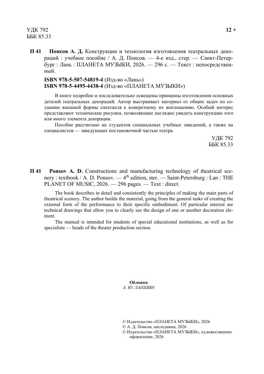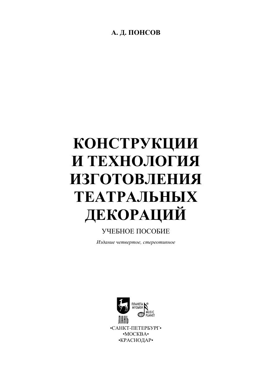 В книге подробно и последовательно освещены принципы изготовления основных деталей театральных декораций. Автор выстраивает материал, идя от общих задач по созданию внешней формы спектакля к конкретному их воплощению. Особый интерес представляют технические рисунки, позволяющие наглядно увидеть конструкцию того или иного элемента декорации. Рассчитан на студентов специальных учебных заведений, а также на специалистов — заведующих постановочной частью театра. The book describes in detail and consistently the principles of making the main parts of theatrical scenery. The author builds the material, going from the general tasks of creating the external form of the performance to their specific embodiment. Of particular interest are technical drawings that allow you to clearly see the design of one or another decoration element. The manual is intended for students of special educational institutions, as well as for specialists — heads of the theater production section.