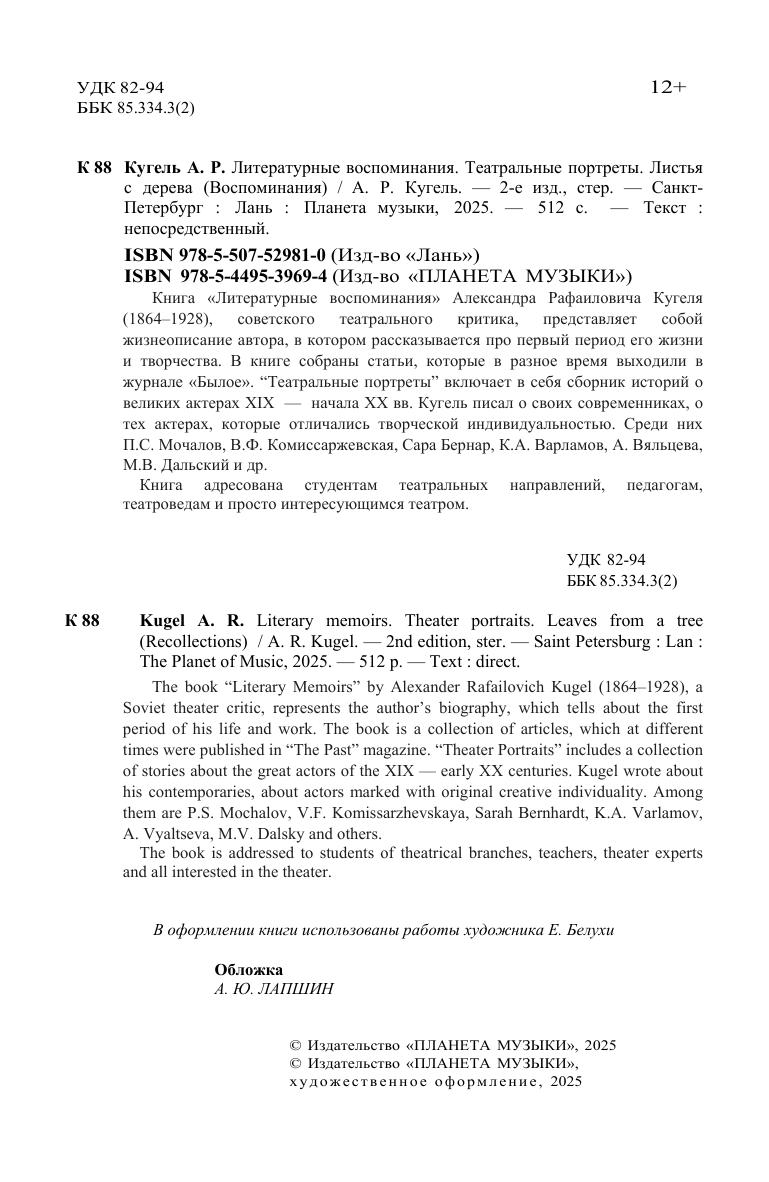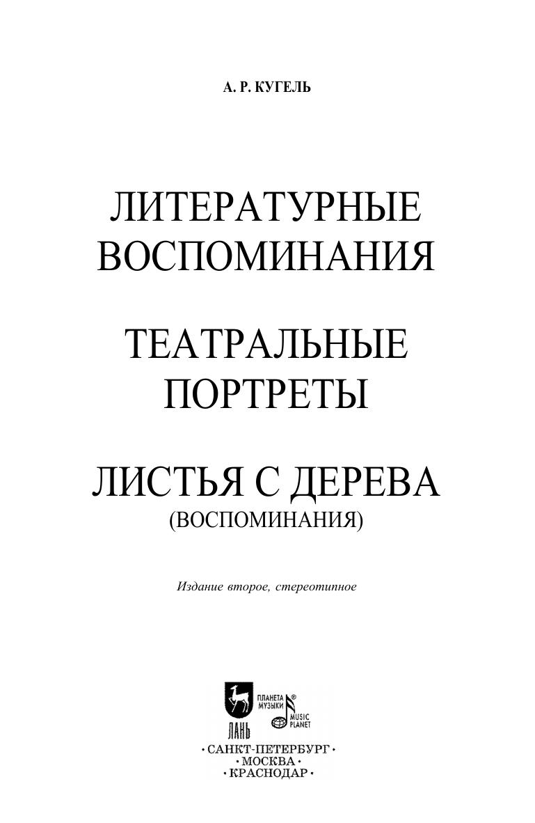 Книга «Литературные воспоминания» Александра Рафаиловича Кугеля (1864-1928), советского театрального критика, представляет собой жизнеописание автора, в котором рассказывается про первый период его жизни и творчества. В книге собраны статьи, которые в разное время выходили в журнале «Былое». "Театральные портреты" включает в себя сборник историй о великих актерах XIX – начала XX вв. Кугель писал о своих современниках, о тех актерах, которые отличались творческой индивидуальностью. Среди них П.С. Мочалов, В.Ф. Комиссаржевская, Сара Бернар, К.А. Варламов, А. Вяльцева, М.В. Дальский и др. Книга адресована студентам театральных направлений, педагогам, театроведам и всем интересующимся театром.