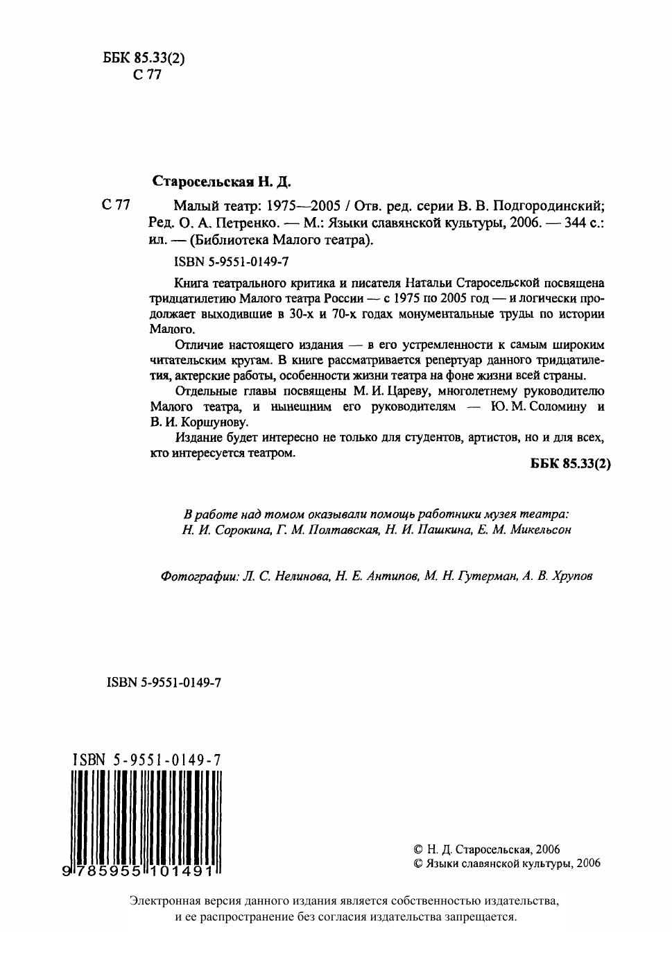 Книга театрального критика и писателя Натальи Старосельской посвящена тридцатилетию Малого театра России – с 1975 по 2005 год – и логически продолжает выходившие в 30-х и 70-х годах монументальные труды по истории Малого. Отличие настоящего издания – в его устремленности к самым широким читательским кругам. В книге рассматривается репертуар данного тридцатилетия, актерские работы, особенности жизни театра на фоне жизни всей страны. Отдельные главы посвящены М. И. Цареву, многолетнему руководителю Малого театра, и нынешним его руководителям – Ю. М. Соломину и В. И. Коршунову. Издание будет интересно не только для студентов, артистов, но и для всех, кто интересуется театром.
