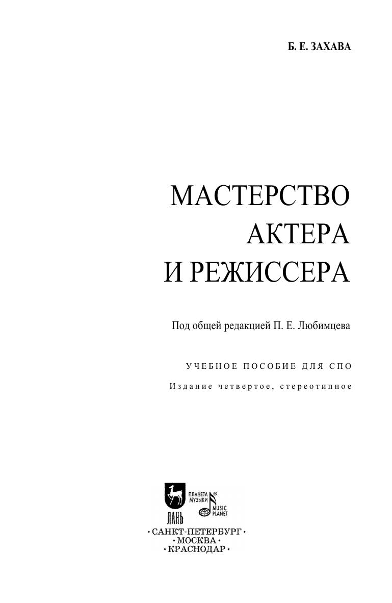 Б. Е. Захава (1896–1976) — выдающийся театральный педагог, режиссер и артист. В данной книге автор обощил весь свой жизненный, актерский и педагогический опыт, сформулировал основные методы воспитания и обучения будущих артистов и режиссеров. Пособие имеет не только теоретическое, но и практическое значение. В нем представлена система упражнений, необходимых всем начинающим актерам. Соответствует современным требованиям Федерального государственного образовательного стандарта среднего профессионального образования и профессиональным квалификационным требованиям. Пособие предназначено для студентов и педагогов средних специальных учебных заведений. B. E. Zakhava (1896–1976) was an outstanding teacher of drama, a director and an actor. In the book the author summarized all his life, acting and pedagogical experience, represented the fundamental methods of teaching the future actors and directors. The textbook is not only of theoretical but also of practical importance. It represents the set of exercises, which are necessary for all the novice actors. Corresponds to the modern requirements of the Federal State Educational Standard of Secondary Vocational Education and professional qualification requirements. The book is intended for the students and teachers of colleges.