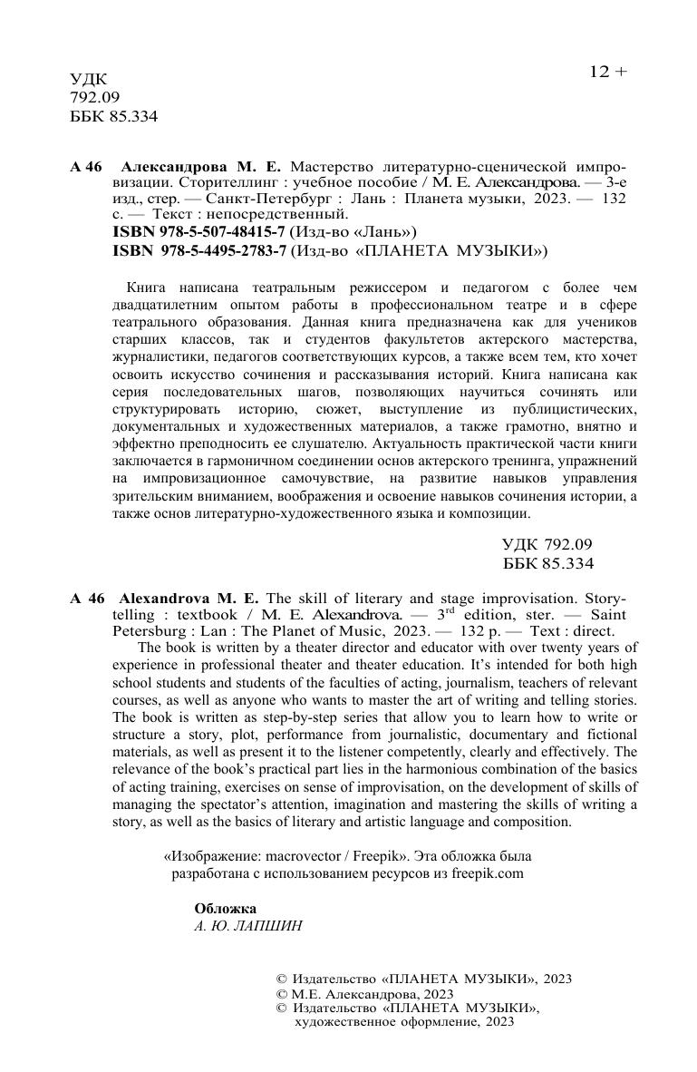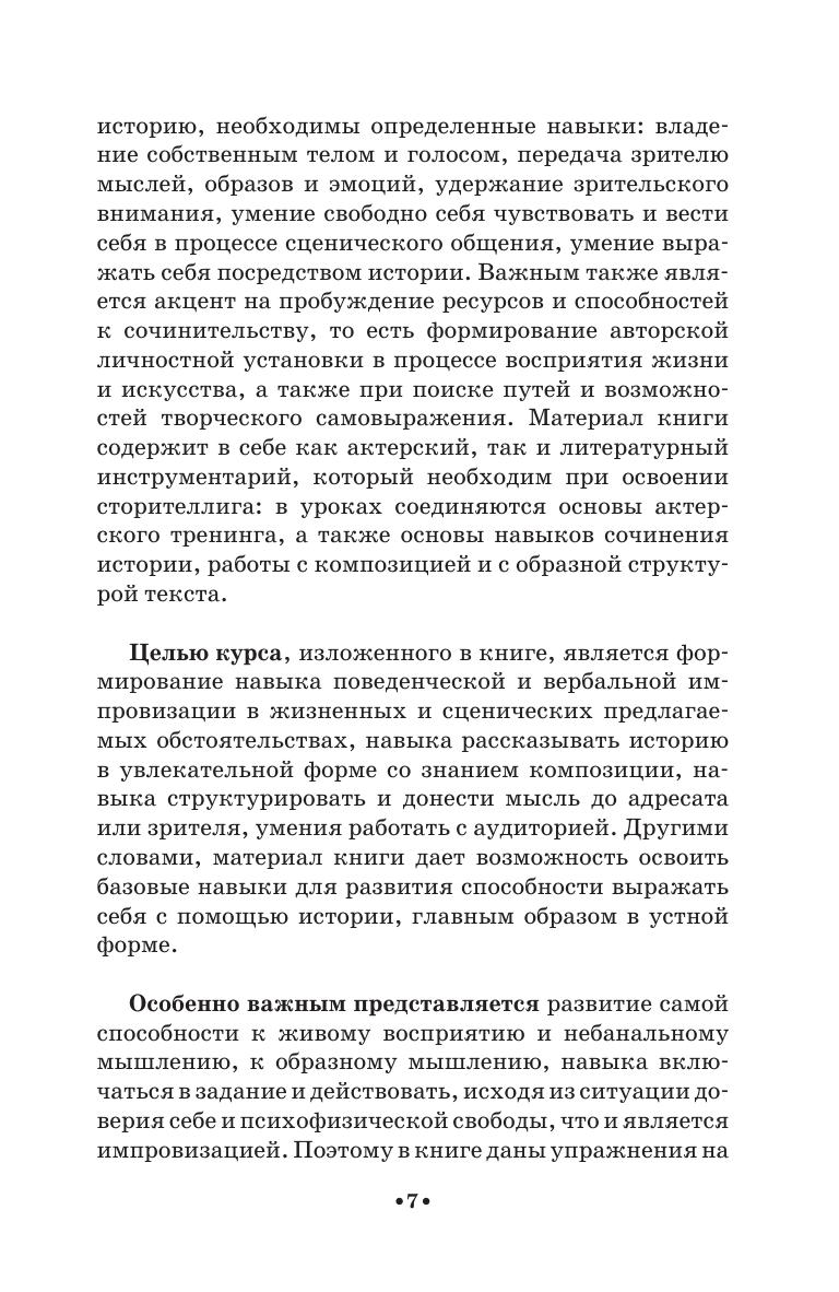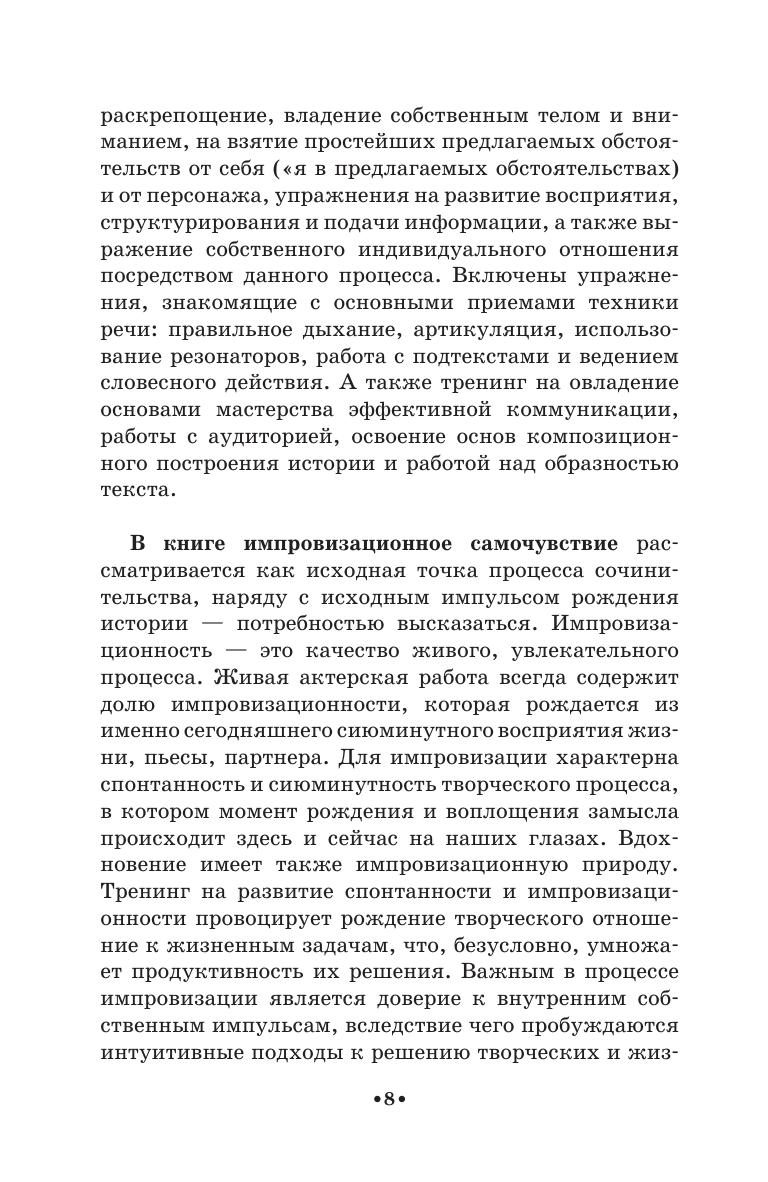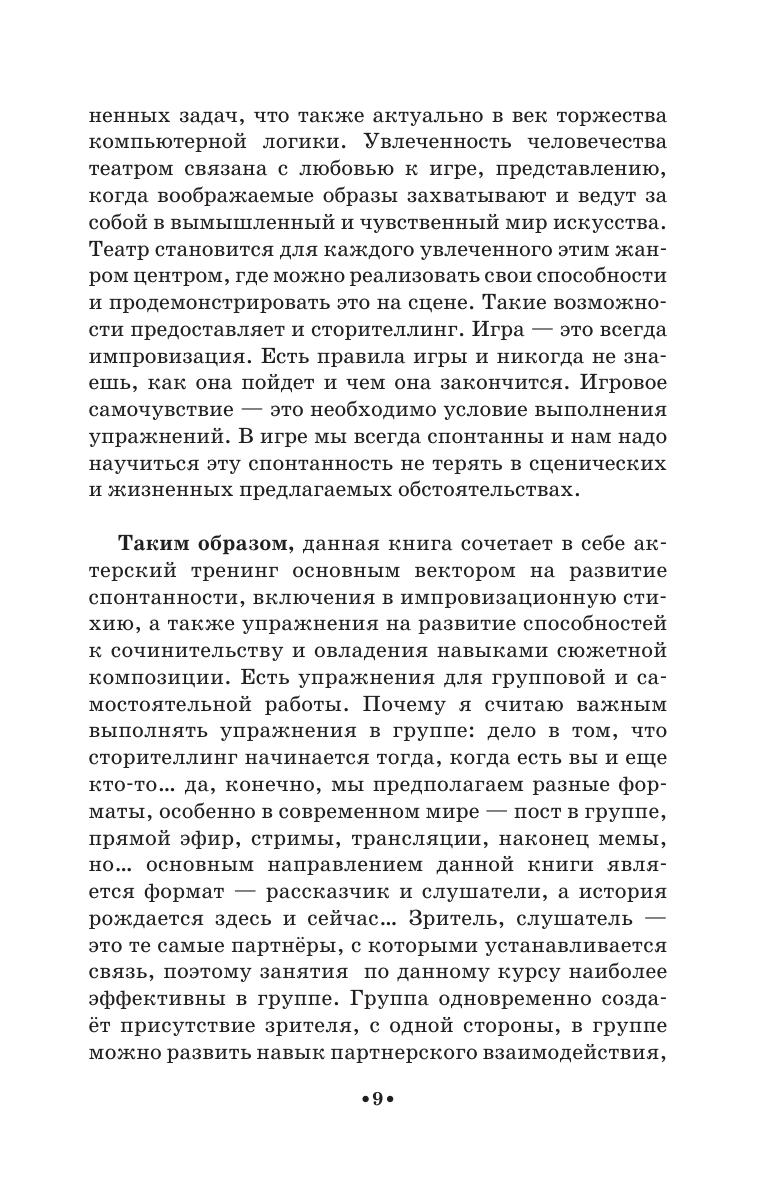 Книга написана театральным режиссером и педагогом с более чем двадцатилетним опытом работы в профессиональном театре и в сфере театрального образования. Данная книга предназначена как для учеников старших классов, так и студентов факультетов актерского мастерства, журналистики, педагогов соответствующих курсов, а также всем тем, кто хочет освоить искусство сочинения и рассказывания историй. Книга написана как серия последовательных шагов, позволяющих научиться сочинять или структурировать историю, сюжет, выступление из публицистических, документальных и художественных материалов, а также грамотно, внятно и эффектно преподносить ее слушателю. Актуальность практической части книги заключается в гармоничном соединении основ актерского тренинга, упражнений на импровизационное самочувствие, на развитие навыков управление зрительским вниманием, воображения и освоение навыков сочинения истории, а также основ литературно – художественного языка и композиции. The book is written by a theater director and educator with over twenty years of experience in professional theater and theater education. It’s intended for both high school students and students of the faculties of acting, journalism, teachers of relevant courses, as well as anyone who wants to master the art of writing and telling stories. The book is written as step-by-step series that allow you to learn how to write or structure a story, plot, performance from journalistic, documentary and fictional materials, as well as present it to the listener competently, clearly and effectively. The relevance of the book’s practical part lies in the harmonious combination of the basics of acting training, exercises on sense of improvisation, on the development of skills of managing the spectator’s attention, imagination and mastering the skills of writing a story, as well as the basics of literary and artistic language and composition.