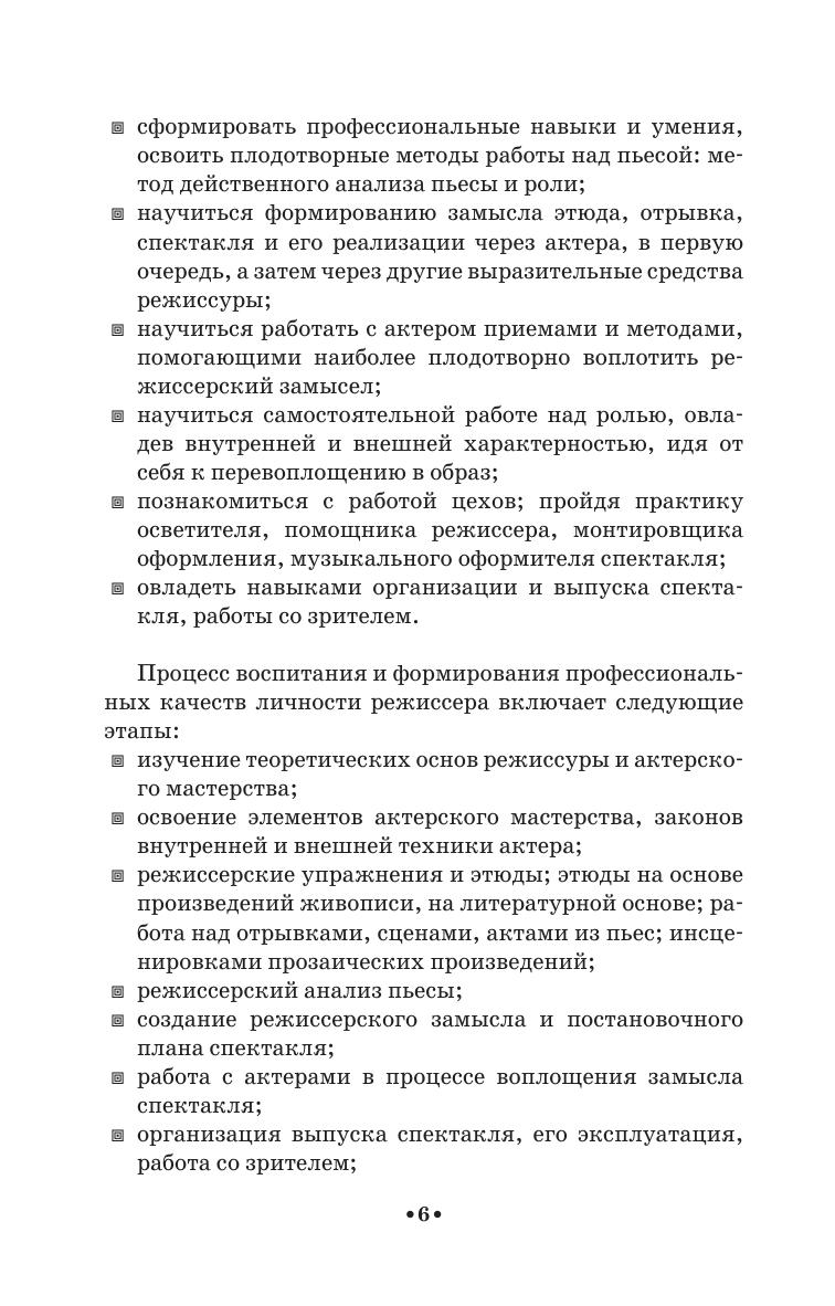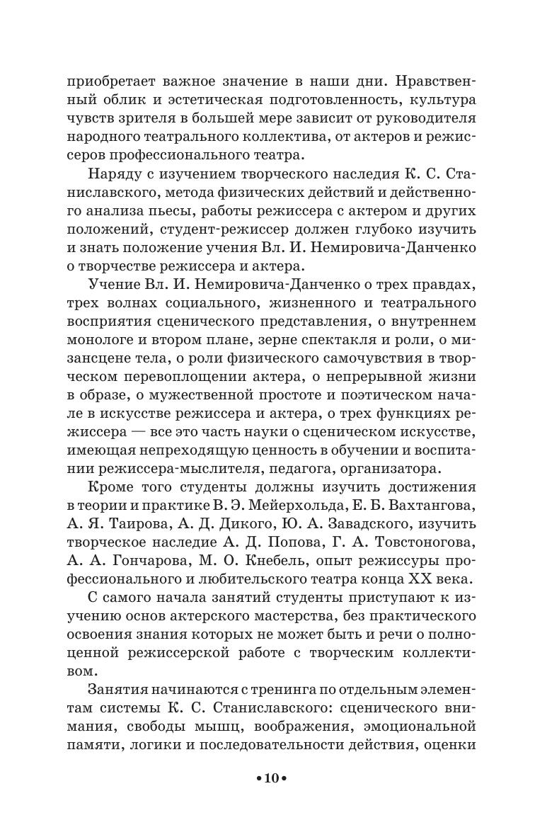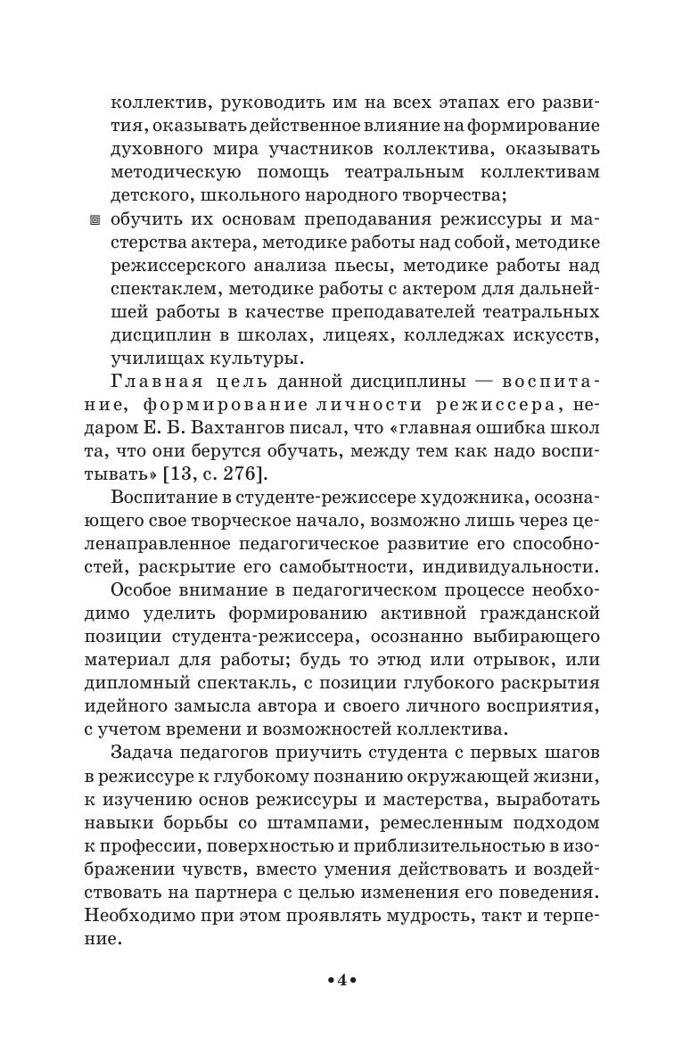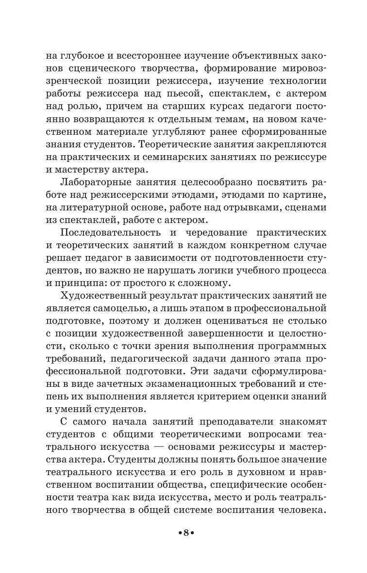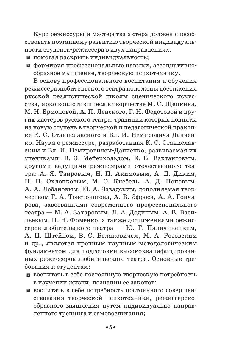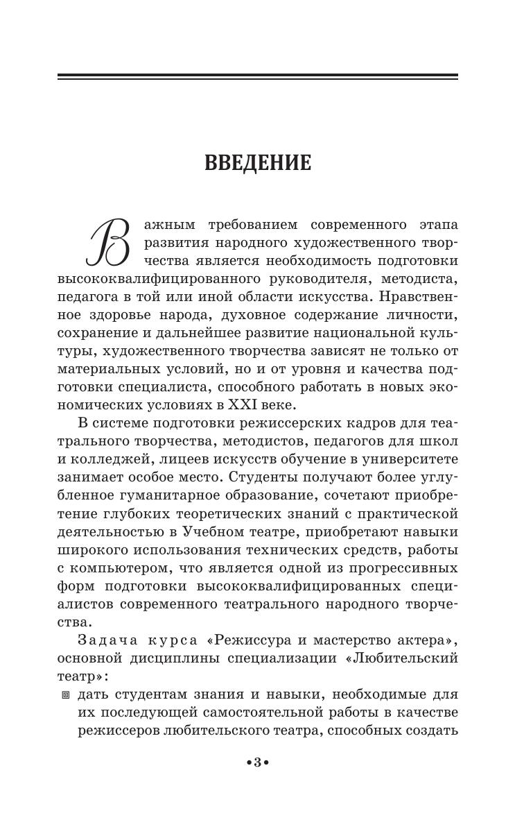 Учебное пособие представляет собой авторскую программу, рассчитанную на пятилетний срок очной формы обучения по специальности «Народное художественное творчество» (специализация: «Любительский театр, режиссёр самодеятельного театрального коллектива»). Работа включает в себя методические требования по дисциплинам «Режиссура» и «Мастерство актёра» за каждый курс, задачи и цели обучения, примерный учебный план по курсам. Для каждого семестра предложен тематический план, содержание учебных тем, планы практических и индивидуальных занятий, примерная тематика вопросов к экзаменам и зачётам, контрольные вопросы, основная и дополнительная литература в конце каждого года обучения.