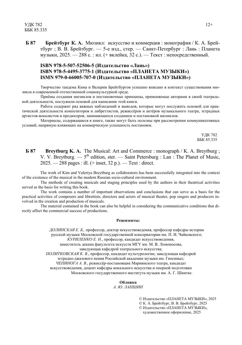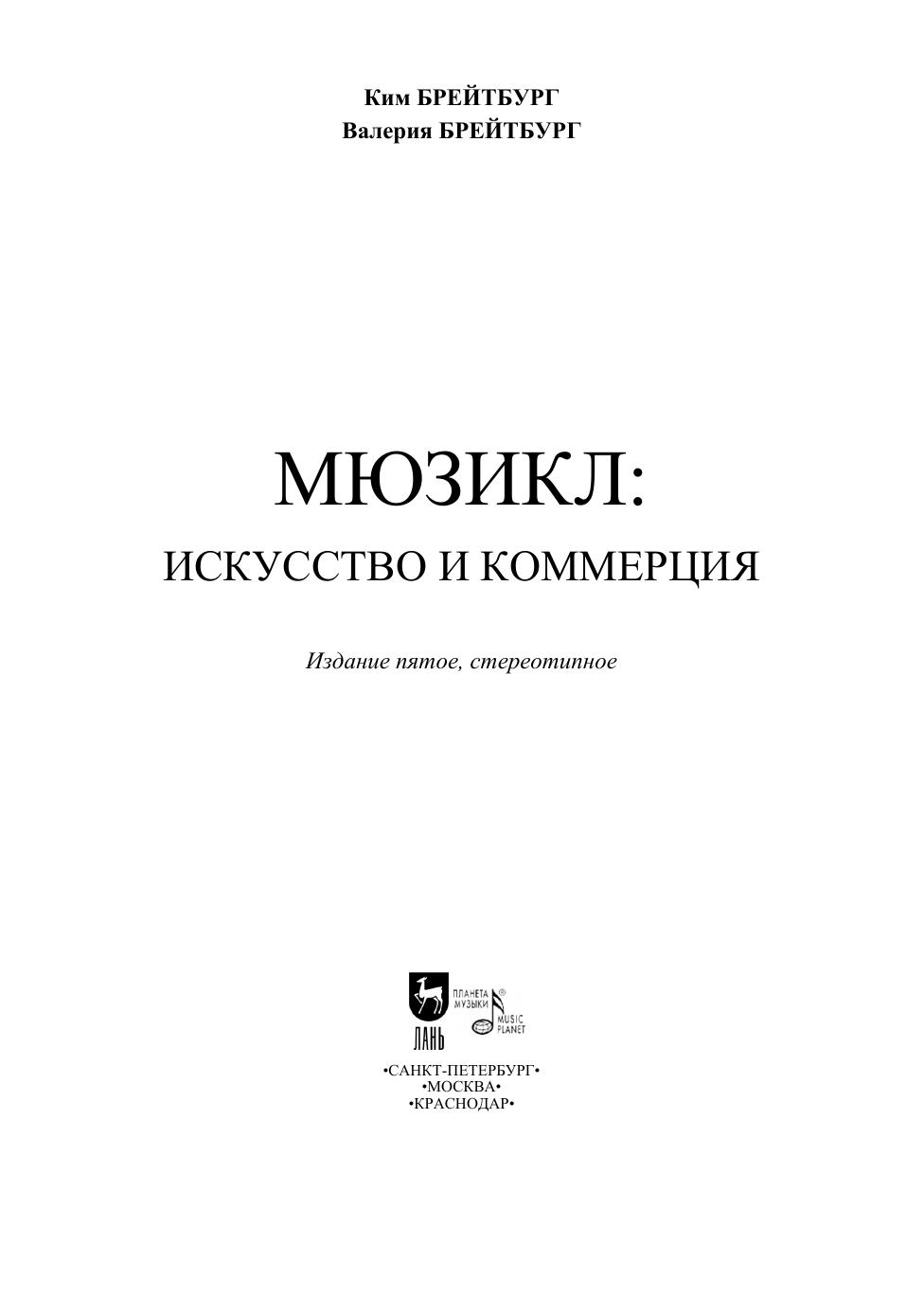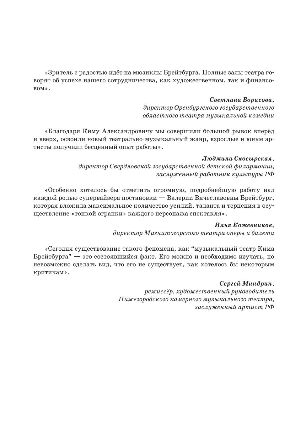 Творчество тандема Кима и Валерии Брейтбургов успешно вписано в контекст существования мюзикла в современной отечественной социокультурной среде. Приёмы создания мюзиклов и постановочные принципы, применяемые авторами в своей театральной деятельности, послужили основой для написания этой книги. Работа содержит ряд важных наблюдений и выводов, которые могут послужить основой для практической деятельности композиторов и либреттистов, режиссёров и актёров музыкального театра, эстрадных артистов-вокалистов и продюсеров, занимающихся созданием и постановкой мюзиклов. Материалы, содержащиеся в книге, также могут быть полезны при рассмотрении коммуникативных условий, напрямую влияющих на коммерческую успешность постановок.