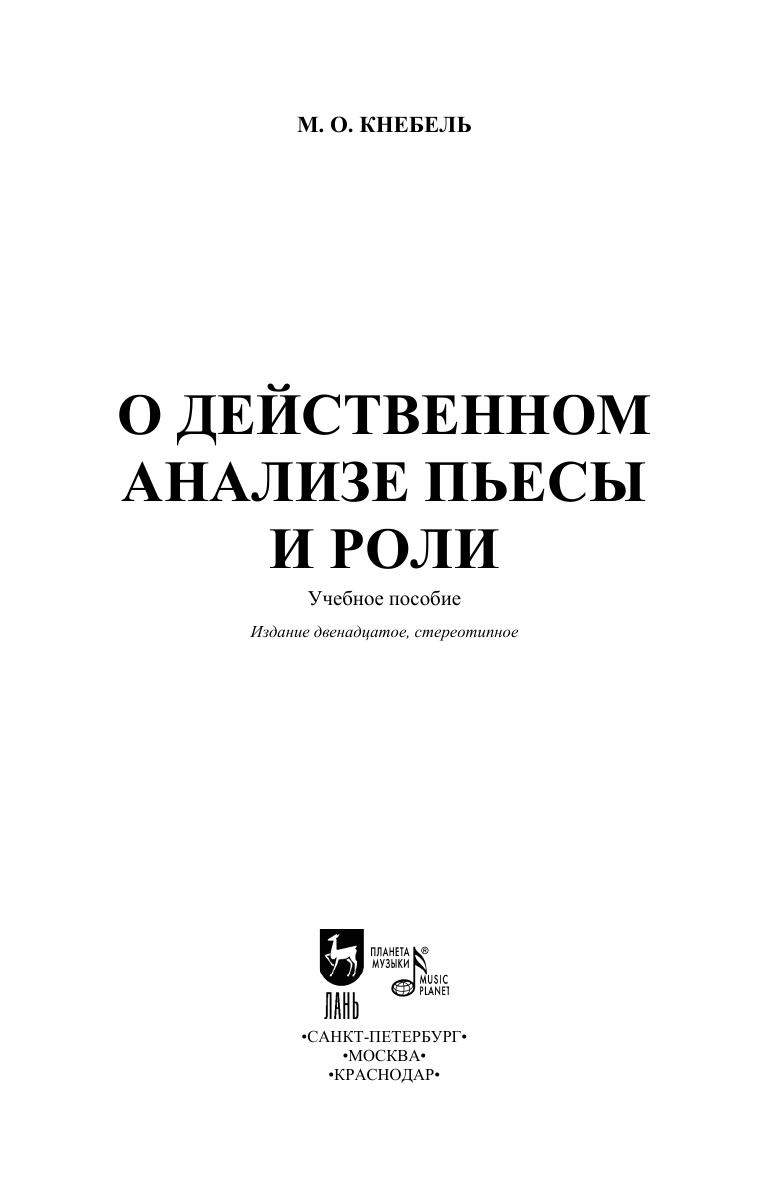 Мария Осиповна Кнебель (1898–1985) — замечательный театральный педагог и режиссер. М. О. Кнебель оставила большое творческое наследие, которое не теряет своей актуальности и в наше время. В данном издании представлены две ее работы. Книга адресована режиссерам, актерам, педагогам, студентам театральных вузов.
