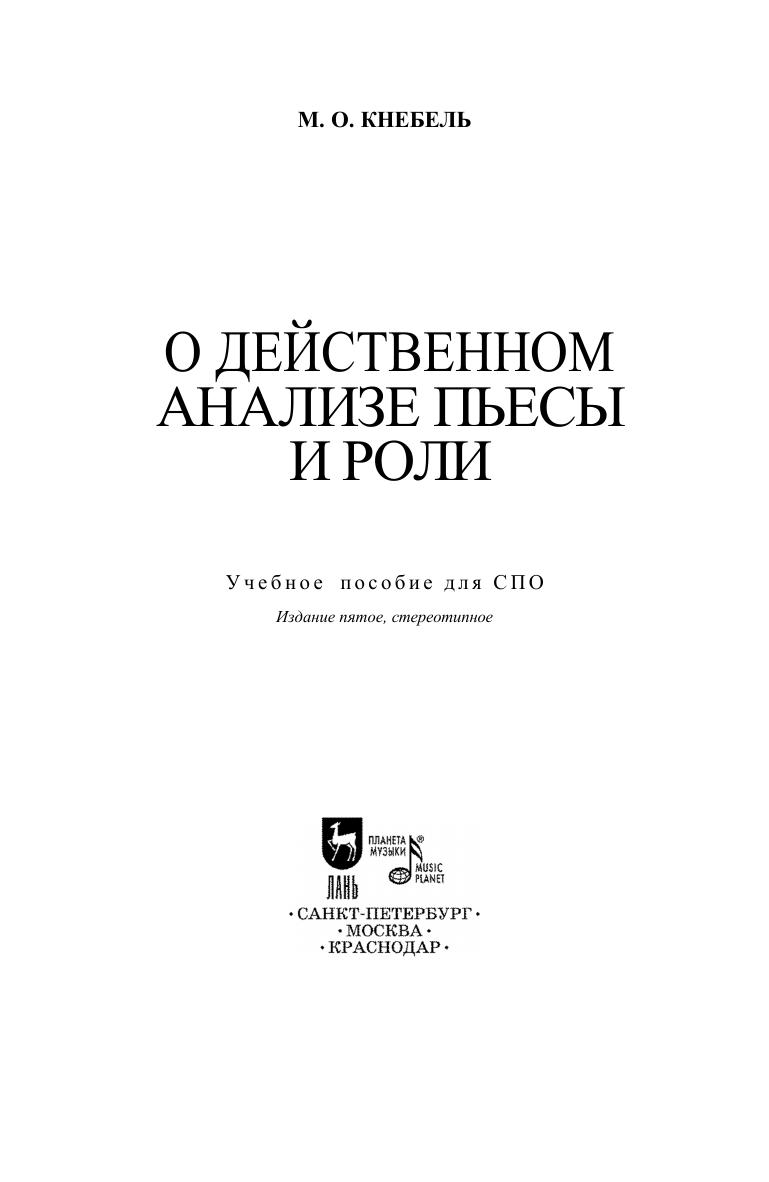 Мария Осиповна Кнебель (1898–1985) — замечательный театральный педагог и режиссера. М. О. Кнебель оставила большое творческое наследие, которое не теряет своей актуальности и в наше время. В данном издании представлены две ее работы. Книга адресована студентам и педагогам средних специальных учебных заведений. Maria Osipovna Knebel (1898–1985) was a remarkable theatre teacher and director. M.O.Knebel left a great artistic heritage, which has not lost its relevance even today. There are two her works in this publication. The book is addressed to students and teachers of colleges.