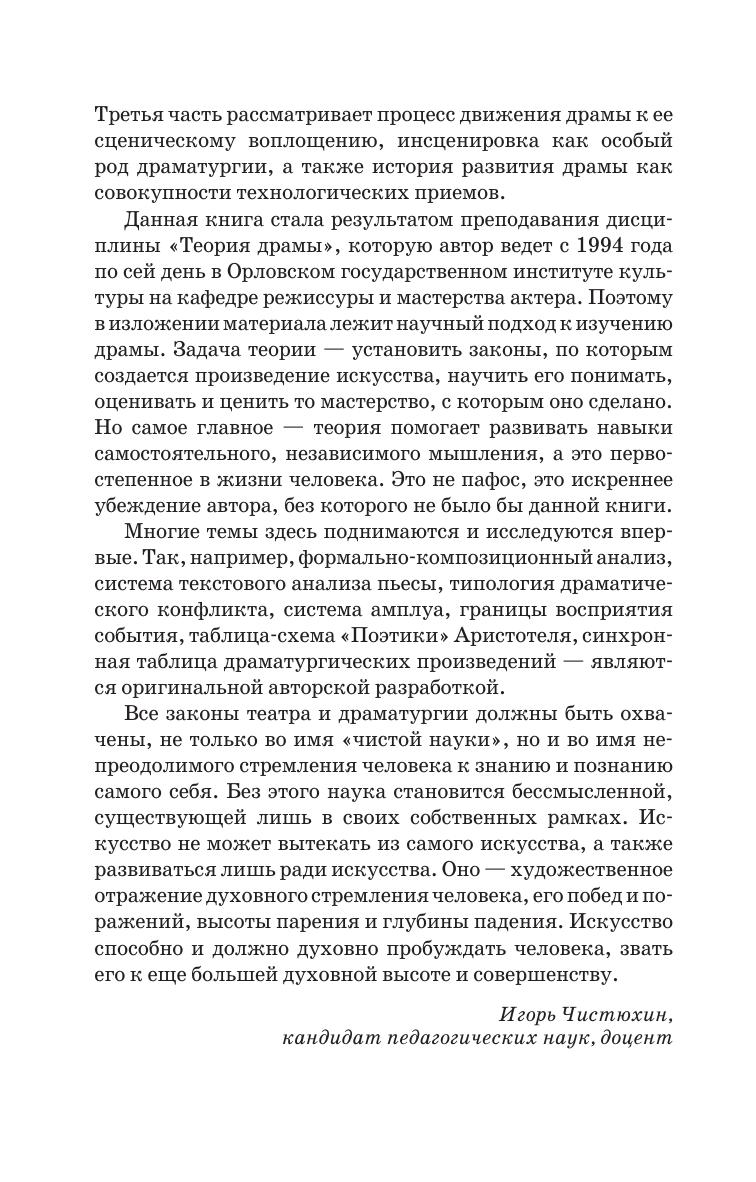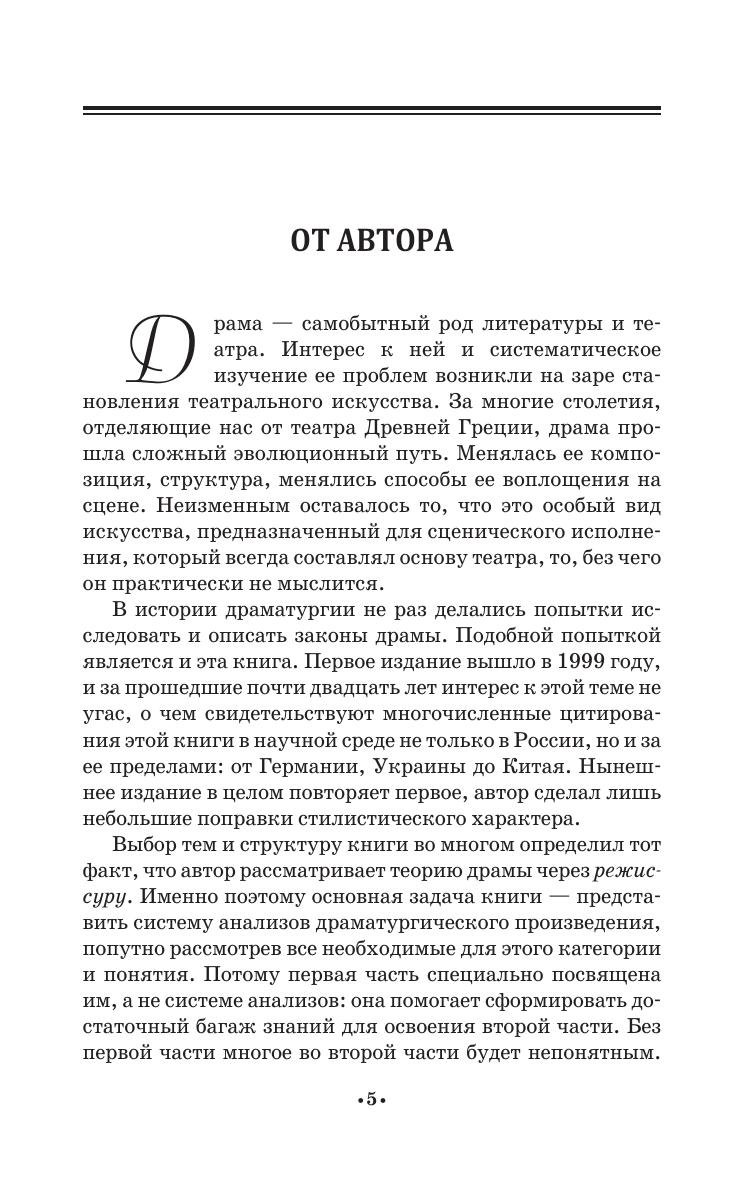 Книга посвящена изучению законов драматургии, процесса исторического развития драмы, основных этапов в эволюции драматических жанров и форм. Подробно рассматриваются основные драматургические категории и понятия. Представлена система анализов драматургического произведения. Описан процесс движения драмы к ее сценическому воплощению, инсценировка как особый род драматургии, а также история развития драмы, как совокупности технологических приемов.