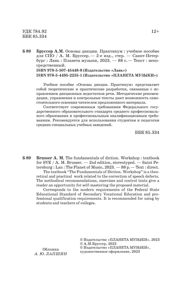 The textbook “The Fundamentals of Diction. Workshop" is a theoretical and practical work related to the correction of speech defects. The methodical recommendations, exercises and control texts give a reader an opportunity for self-mastering the proposed material.