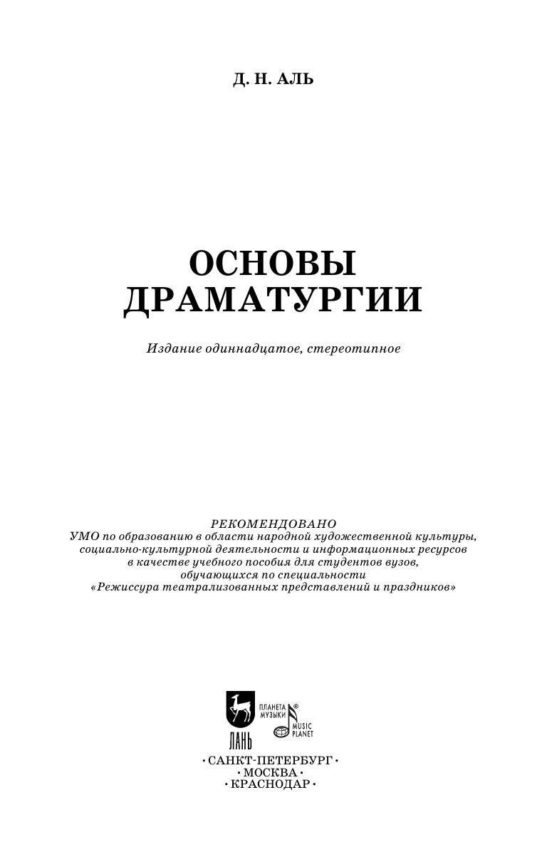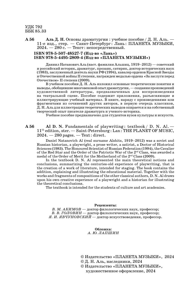 Даниил Натанович Аль (наст. фамилия Альшиц, 1919–2012) — советский и российский историк, драматург, прозаик, сатирик, доктор исторических наук (1983), заслуженный деятель науки РФ (1994), кавалер орденов Красной Звезды и Отечественной войны II степени, награжден медалью ордена «За заслуги перед Отечеством» II степени (2009). В учебном пособии Д. Н. Аль изложил основные теоретические понятия и выводы, обобщившие многовековой опыт драматургии — создания произведений художественной литературы, предназначенных для воспроизведения на театральной сцене. Пособие содержит приложения, разъясняющие и иллюстрирующие учебный материал. В книге, наряду с произведениями или фрагментами из сочинений других авторов, в первую очередь классиков, Д. Н. Аль для иллюстрации теоретических выводов опирается и на собственный творческий опыт писателя-драматурга и ученого-историка. Учебное пособие предназначено для студентов вузов культуры и искусств. Daniel Natanovich Al (real surname Alshits, 1919–2012) was a soviet and Russian historian, a playwright, a prose writer, a satirist, a Doctor of Historical Sciences (1983). The Honoured Scientist of Russian Federation (1994), the Cavalier of the Red Star and the Order of the Patriotic War of the 2nd Class, was awarded a medal of the Order of Merit for the Motherland of the 2nd Class (2009). In the textbook D. N. Al represented the main theoretical notions and conclusions, summarizing the centuries-old experience of playwriting, that is the creation of a work of literature, intended for staging. The book contains the addition, explaining and illustrating the educational material. Together with the works and fragments of compositions of the other classical authors, D. N. Al draws upon his own creative experience of a playwright and a historian for illustrating the theoretical conclusions. The textbook is intended for the students of culture and art academies.