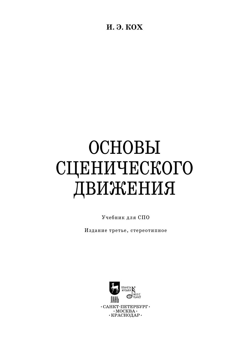 Сценическое движение— одна из важнейших дисциплин, воспитывающих внешнюю технику актера. О создании учебника по сценическому движению мечтал еще К. С. Станиславский. Книга И. Э. Коха и была первой попыткой создания такого учебника. Сценическое движение автор рассматривает в тесной связи со сценическим действием, т.е. мастерством актера. Теоретическую и практическую стороны своей работы, методику преподавания И. Э. Кох основывает на учении Станиславского и трудах современных психологов и физиологов. Большую ценность представляет та часть учебника, которая знакомит с этикетом и правилами поведения в быту XVI–XIX веков на Западе и в России. Отсутствие серьезных работ по истории быта прошедших эпох делает эту часть книги особенно нужной и интересной. Книга представляет собой в полном смысле слова энциклопедию по сценическому движению, начиная с общих теоретических вопросов и кончая мельчайшими практическими деталями. Учебное пособие снабжено большим количеством рисунков, нотными примерами. Соответствует современным требованиям Федерального государственного образовательного стандарта среднего профессионального образования и профессиональным квалификационным требованиям. Учебник предназначен для студентов и педагогов средних специальных учебных заведений. Stage movement is one of the most important subjects, which trains the outer technic of an actor. K. S. Stanislavsky dreamed of the creation of a textbook on stage movement long ago. The book by I.E. Kokh was just the first try of doing it. The stage movement is considered by the author in close connection with the stage action that is the stagecraft of an actor. Theoretical and practical aspects of the work and teaching methods are based by I. E. Kokh on Stanislavsky’s approach and the works of modern psychologists and physiologists. The part of the book, which tells about the etiquette and the rules of conduct in 16th–19th centuries on the West and in Russia, is of great value. No serious works on the history of everyday life of the past ages were published earlier. It makes the reference part of the book especially useful and interesting. Corresponds to the modern requirements of the Federal State Educational Standard of Secondary Vocational Education and professional qualification requirements. The book is, in the true sense of the word, the encycloped