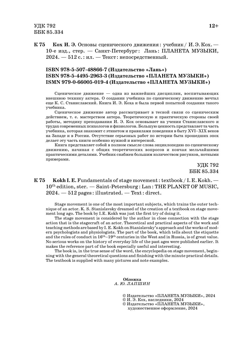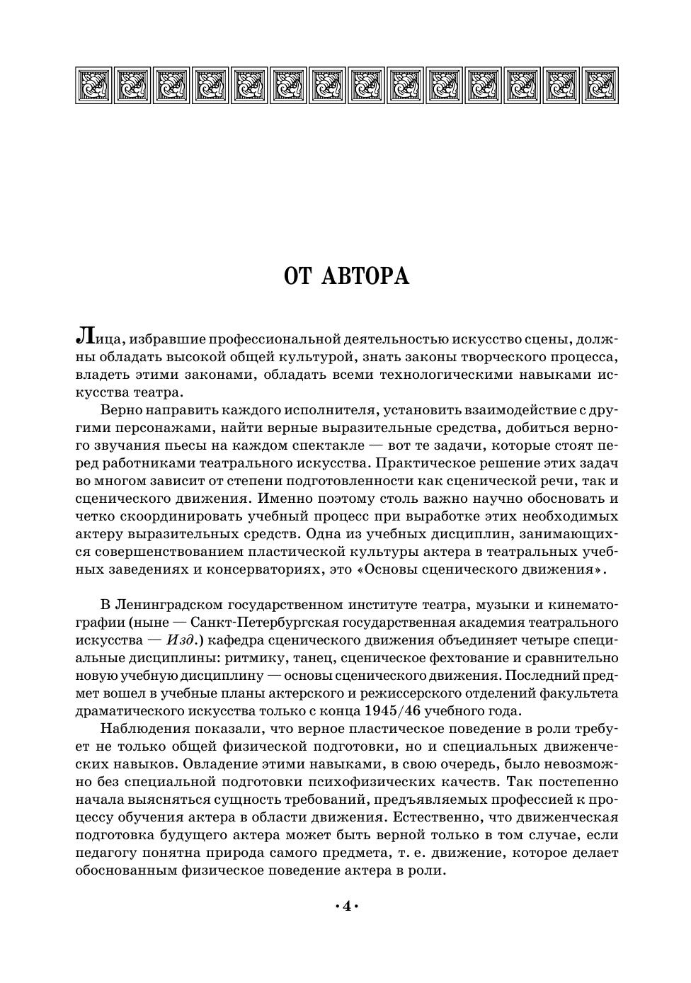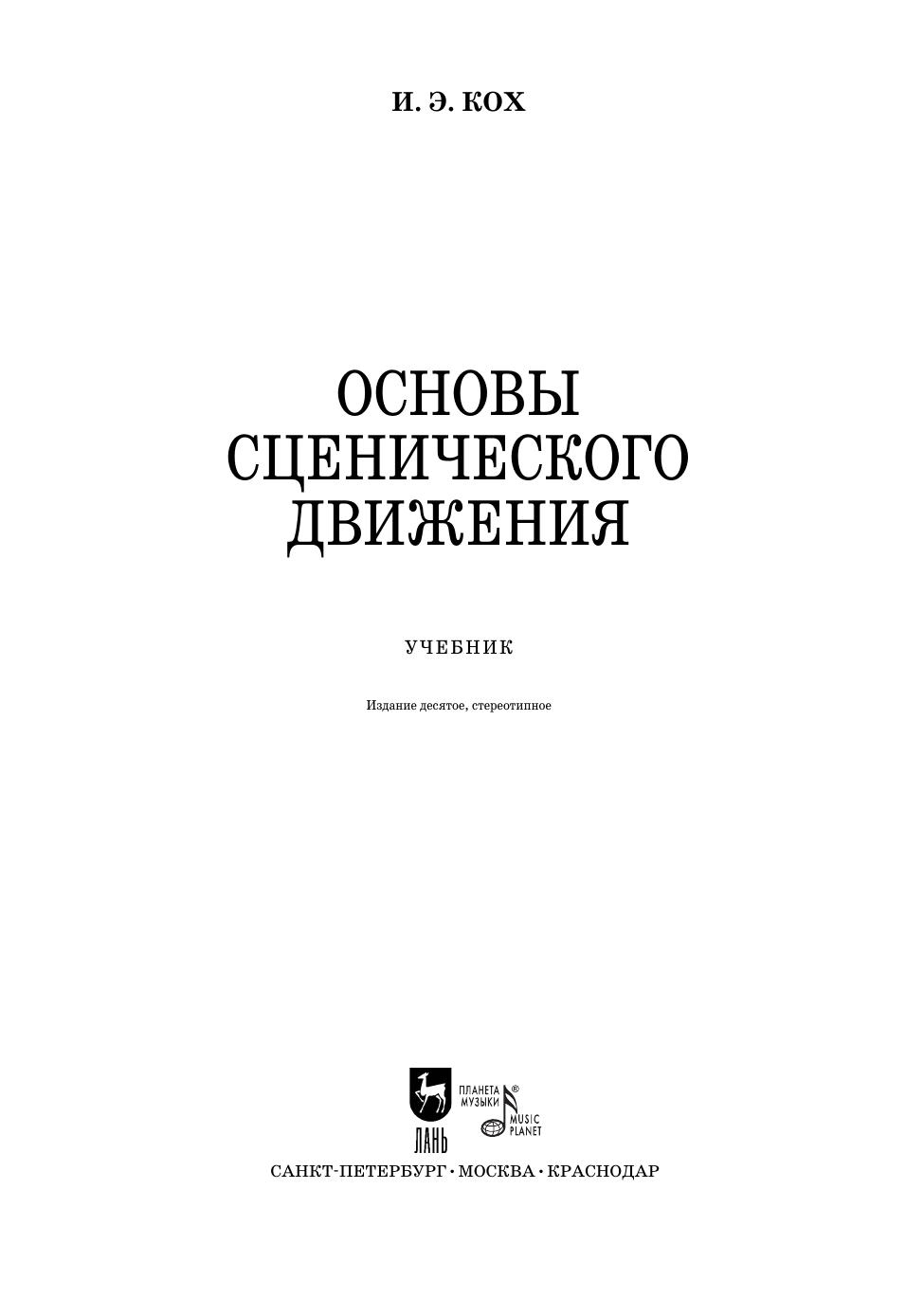 Сценическое движение— одна из важнейших дисциплин, воспитывающих внешнюю технику актера. О создании учебника по сценическому движению мечтал еще К. С. Станиславский. Книга И. Э. Коха и была первой попыткой создания такого учебника. Сценическое движение автор рассматривает в тесной связи со сценическим действием, т.е. мастерством актера. Теоретическую и практическую стороны своей работы, методику преподавания И. Э. Кох основывает на учении Станиславского и трудах современных психологов и физиологов. Большую ценность представляет та часть учебника, которая знакомит с этикетом и правилами поведения в быту XVI–XIX веков на Западе и в России. Отсутствие серьезных работ по истории быта прошедших эпох делает эту часть книги особенно нужной и интересной. Книга представляет собой в полном смысле слова энциклопедию по сценическому движению, начиная с общих теоретических вопросов и кончая мельчайшими практическими деталями. Учебное пособие снабжено большим количеством рисунков, нотными примерами.