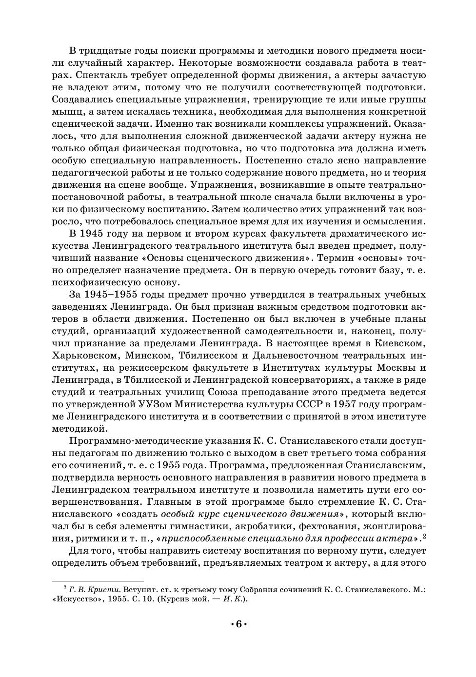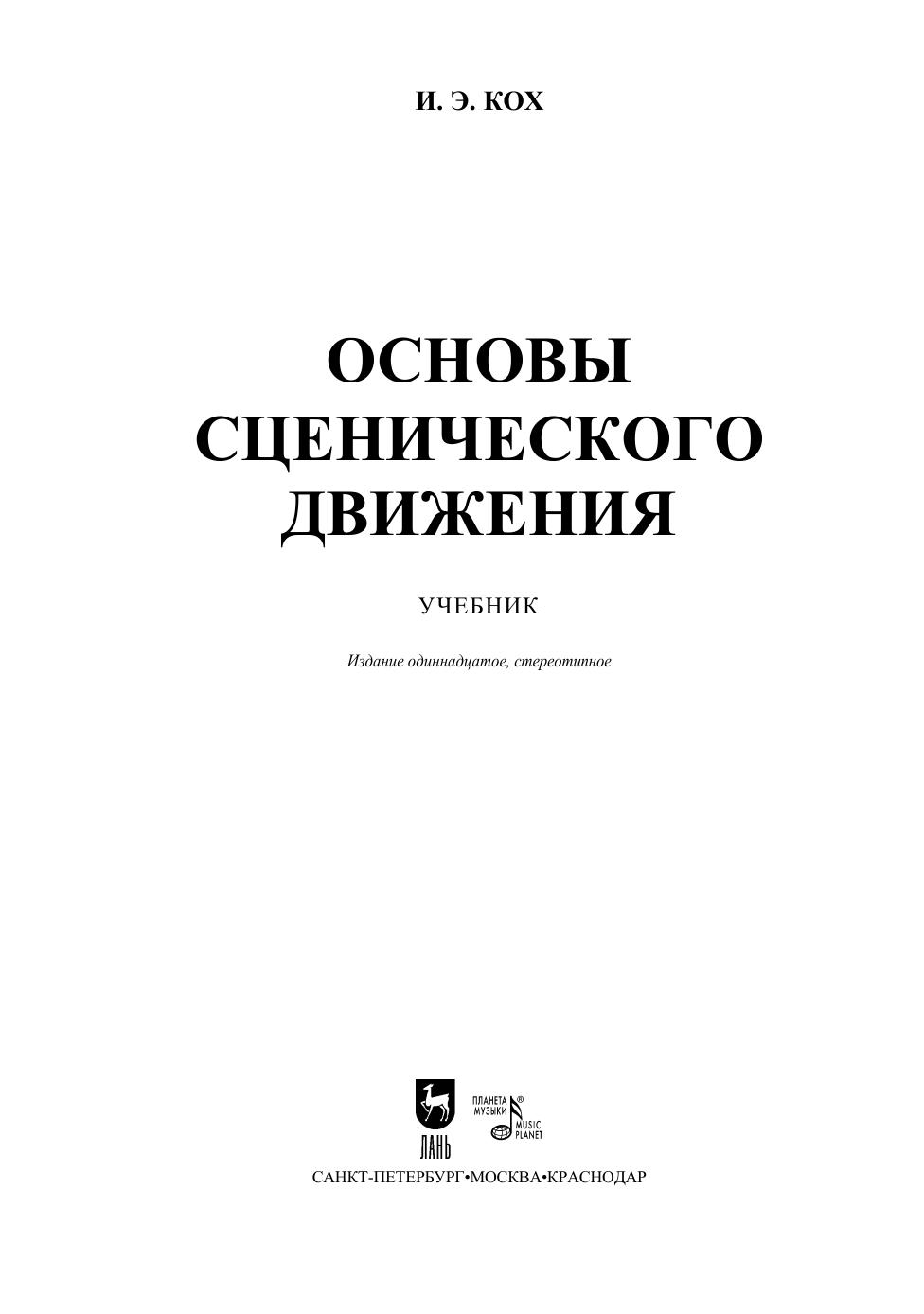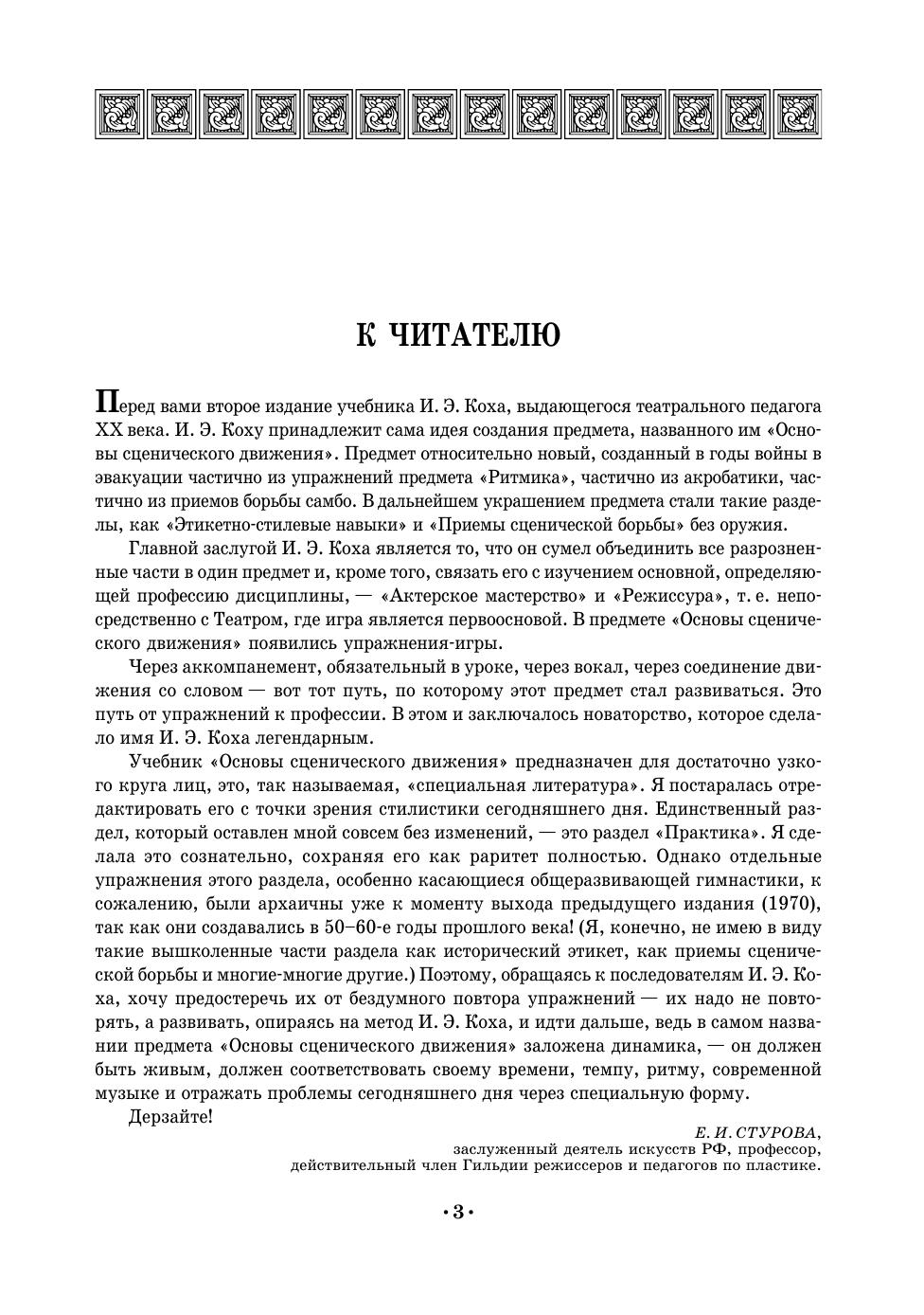 Сценическое движение— одна из важнейших дисциплин, воспитывающих внешнюю технику актера. О создании учебника по сценическому движению мечтал еще К. С. Станиславский. Книга И. Э. Коха и была первой попыткой создания такого учебника. Сценическое движение автор рассматривает в тесной связи со сценическим действием, т.е. мастерством актера. Теоретическую и практическую стороны своей работы, методику преподавания И. Э. Кох основывает на учении Станиславского и трудах современных психологов и физиологов. Большую ценность представляет та часть учебника, которая знакомит с этикетом и правилами поведения в быту XVI–XIX веков на Западе и в России. Отсутствие серьезных работ по истории быта прошедших эпох делает эту часть книги особенно нужной и интересной. Книга представляет собой в полном смысле слова энциклопедию по сценическому движению, начиная с общих теоретических вопросов и кончая мельчайшими практическими деталями. Учебное пособие снабжено большим количеством рисунков, нотными примерами.