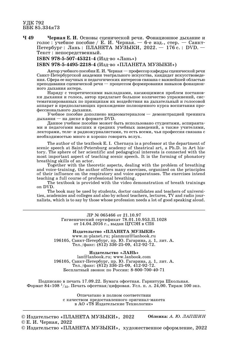 Автор учебного пособия Е. И. Черная — профессор кафедры сценической речи Санкт-Петербургской академии театрального искусства, кандидат искусствоведения. Сфера ее научных и педагогических интересов связана с важнейшей областью преподавания сценической речи — процессом формирования навыков фонационного дыхания актера.