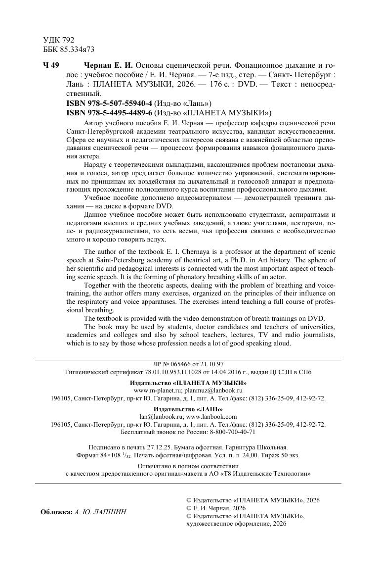 Автор учебного пособия Е.И.Черная— профессор кафедры сценической речи Санкт-Петербургской академии театрального искусства, кандидат искусствоведения. Сфера ее научных и педагогических интересов связана с важнейшей областью преподавания сценической речи— процессом формирования навыков фонационного дыхания актера. Наряду с теоретическими выкладками, касающимися проблем постановки дыхания и голоса, автор предлагает большое количество упражнений, систематизированных по принципам их воздействия на дыхательный и голосовой аппарат и предполагающих прохождение полноценного курса воспитания профессионального дыхания. Учебное пособие дополнено видеоматериалом— демонстрацией тренинга дыхания— на диске в формате DVD. Данное учебное пособие может быть использовано студентами, аспирантами и педагогами высших и средних учебных заведений, а также учителями, лекторами, теле- и радиожурналистами, то есть всеми, чья профессия связана с необходимостью много и хорошо говорить вслух.