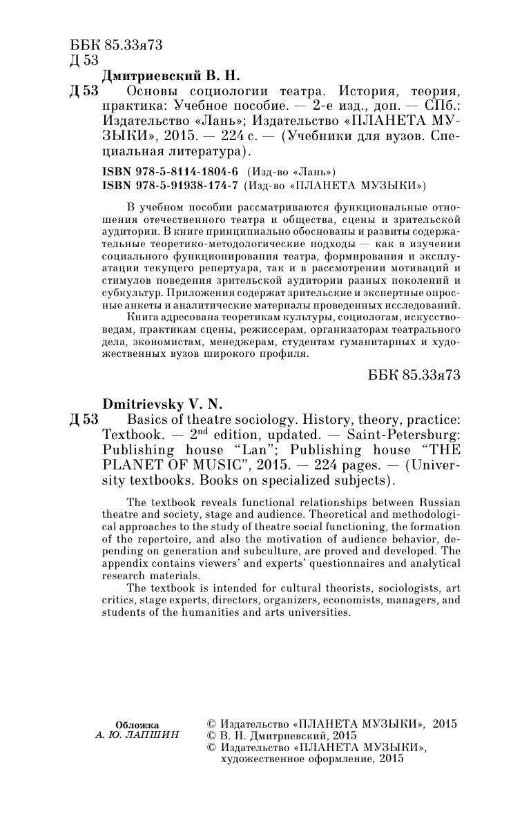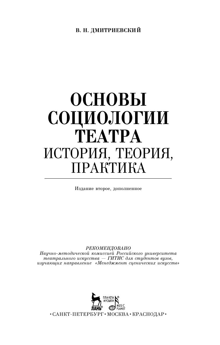 The textbook reveals functional relationships between Russian theatre and society, stage and audience. Theoretical and methodological approaches to the study of theatre social functioning, the formation of the repertoire, and also the motives of audience behavior, depending on generation and subculture, are proved and developed. The appendix contains viewers’ and experts’ questionnaires and analytical research materials. The textbook is intended for cultural theorists, sociologists, art critics, stage experts, directors, organizers, economists, managers, and students of the humanities and arts universities.