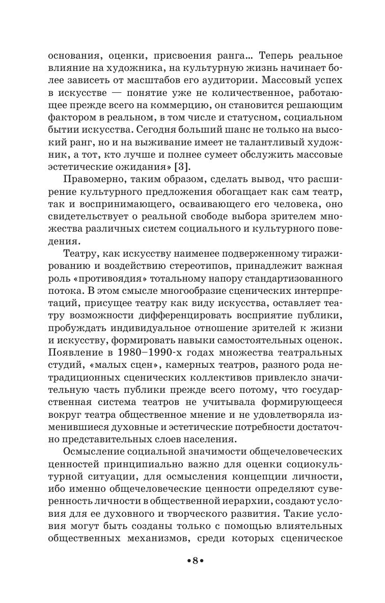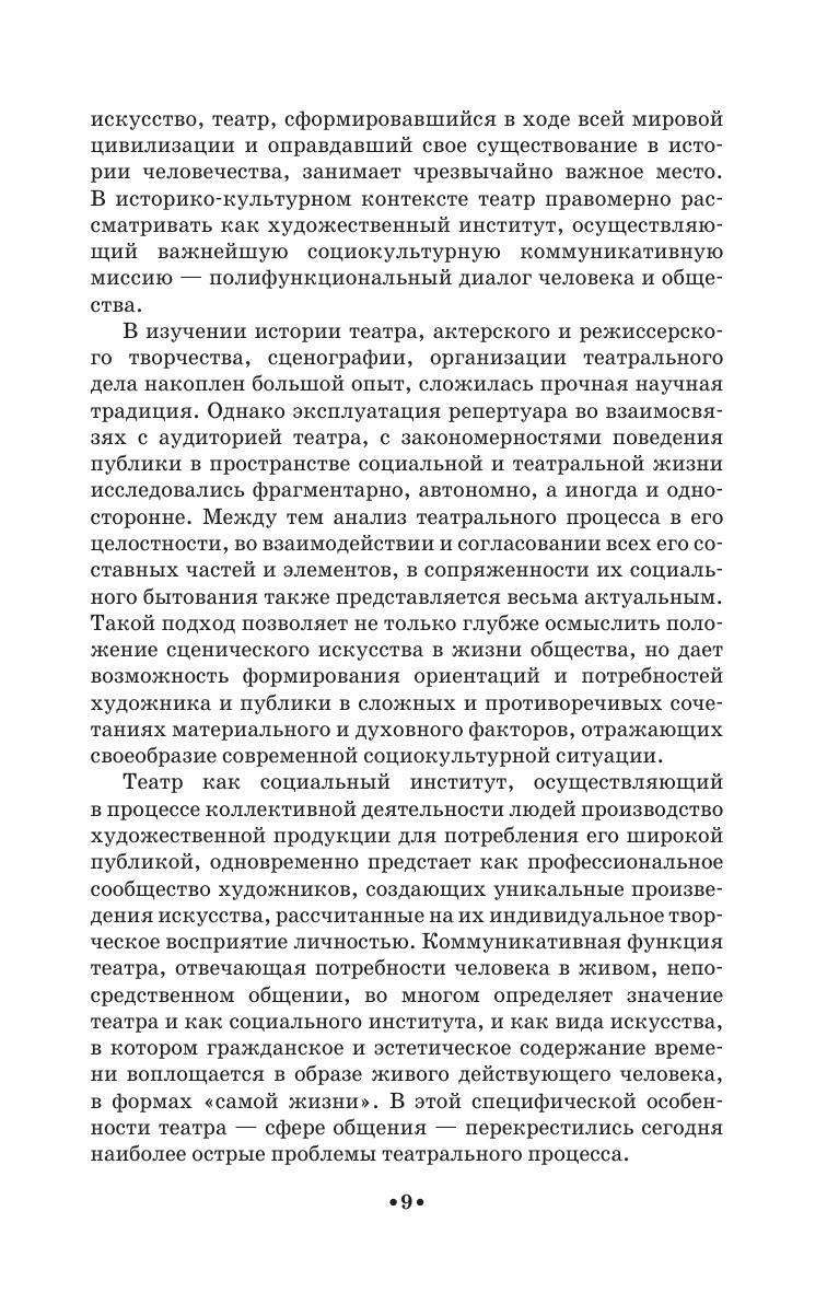 В учебном пособии рассматриваются функциональные отношения отечественного театра и общества, сцены и зрительской аудитории. В книге принципиально обоснованы и развиты содержательные теоретико-методологические подходы – как в изучении социального функционирования театра, формирования и эксплуатации текущего репертуара, так и в рассмотрении мотиваций и стимулов поведения зрительской аудитории разных поколений и субкультур. Приложения содержат зрительские и экспертные опросные анкеты и аналитические материалы проведенных исследований. Книга адресована теоретикам культуры, социологам, искусствоведам, практикам сцены, режиссерам, организаторам театрального дела, экономистам, менеджерам, студентам гуманитарных и художественных вузов широкого профиля.
