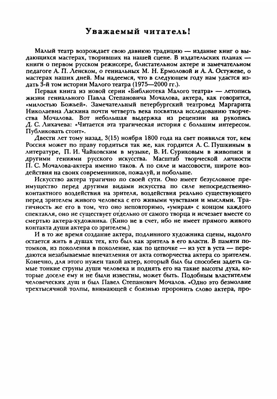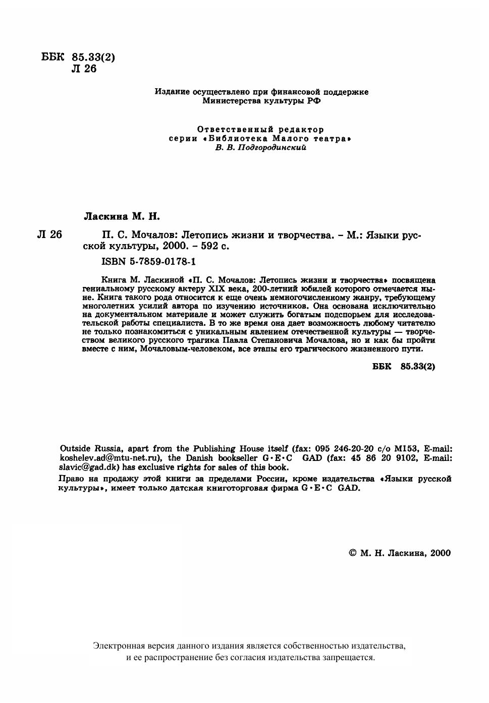 Книга М. Ласкиной "П.С. Мочалов. Летопись жизни и творчества" посвящена гениальному русскому актеру XIX века. Книга такого рода относится к еще очень немногочисленному жанру, требующему многолетних усилий автора по изучению источников. Она основана исключительно на документальном материале и может служить богатым подспорьем для исследовательской работы специалиста. В то же время она дает возможность любому читателю не только познакомиться с уникальным явлением отечественной культуры - творчеством великого русского трагика Павла Степановича Мочалова, но и как бы пройти вместе с ним, Мочаловым-человеком, все этапы его трагического жизненного пути. Для широкого круга читателей.