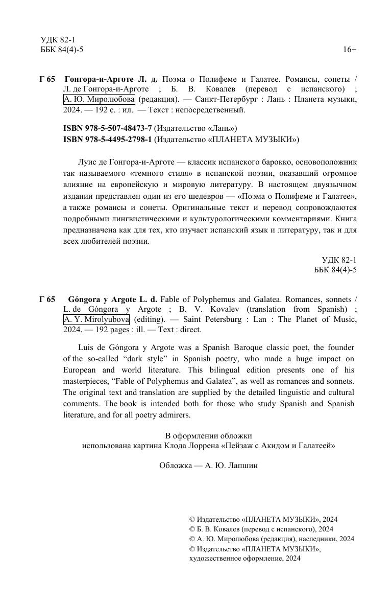 Луис де Гонгора-и-Арготе – классик испанского барокко, основоположник так называемого "темного стиля" в испанской поэзии, оказавший огромное влияние на европейскую и мировую литературу. В настоящем двуязычном издании представлен один из его шедевров – "Поэма о Полифеме и Галатее", а также романсы и сонеты. Оригинальные текст и перевод сопровождаются подробными лингвистическими и культурологическими комментариями. Книга предназначена как для тех, кто изучает испанский язык и литературу, так и для всех любителей поэзии. Luis de Góngora y Argote was a Spanish Baroque classic poet, the founder of the so-called “dark style” in Spanish poetry, who made a huge impact on European and world literature. This bilingual edition presents one of his masterpieces, “Fable of Polyphemus and Galatea”, as well as romances and sonnets. The original text and translation are supplied by the detailed linguistic and cultural comments. The book is intended both for those who study Spanish and Spanish literature, and for all poetry admirers.