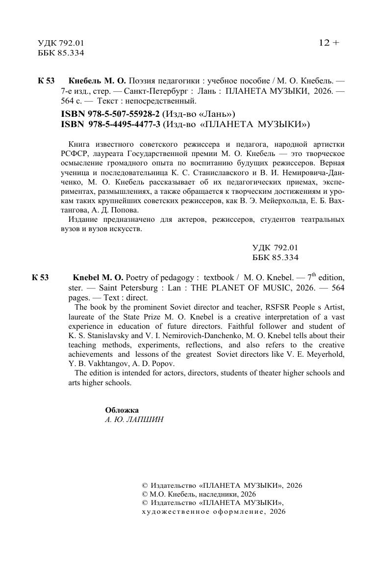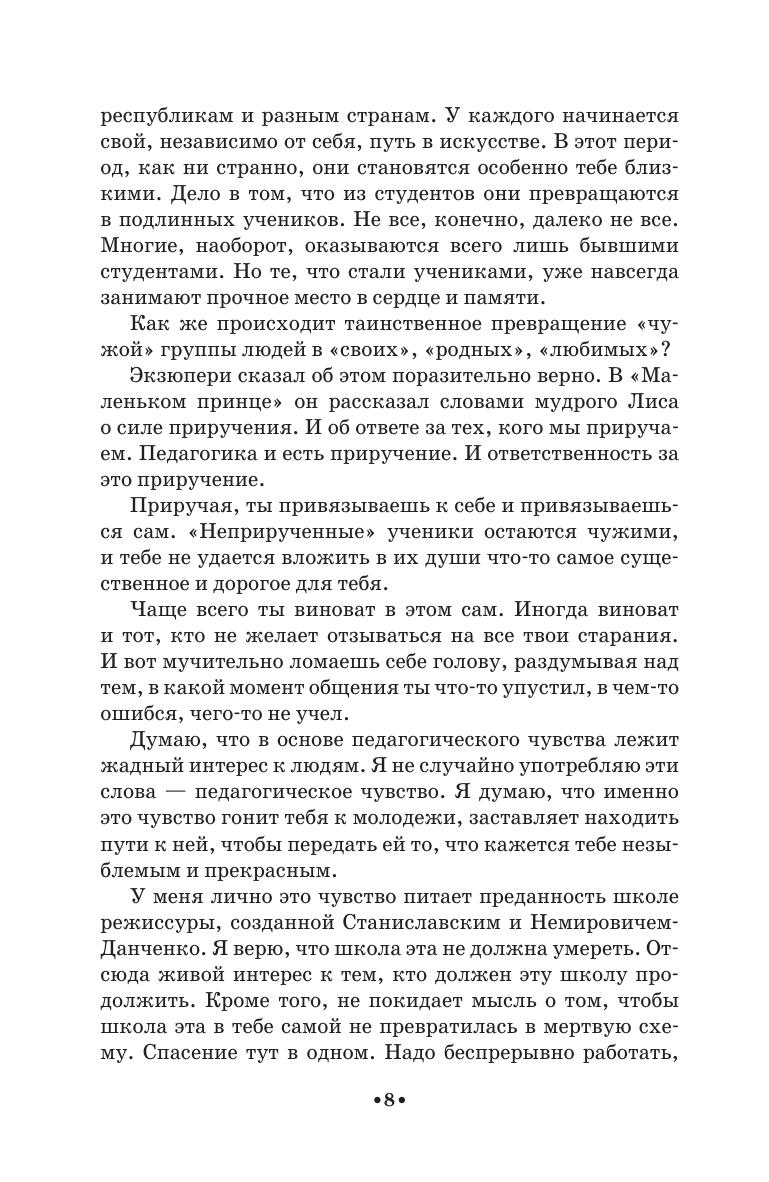 Книга известного советского режиссера и педагога народной артистки РСФСР, лауреата Государственной премии М. О. Кнебель - это творческое осмысление громадного опыта по воспитанию будущих режиссеров. Верная ученица и последовательница К. С. Станиславского и В. И. Немировича-Данченко, М. О. Кнебель рассказывает об их педагогических приемах, экспериментах, размышлениях, а также обращается к творческим достижениям и урокам таких крупнейших советских режиссеров, как В. Э. Мейерхольда, Е. Б. Вахтангова, А. Д. Попова. Издание предназначено для актеров, режиссеров, студентов театральных вузов и вузов искусств.