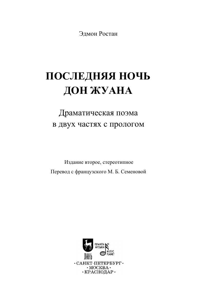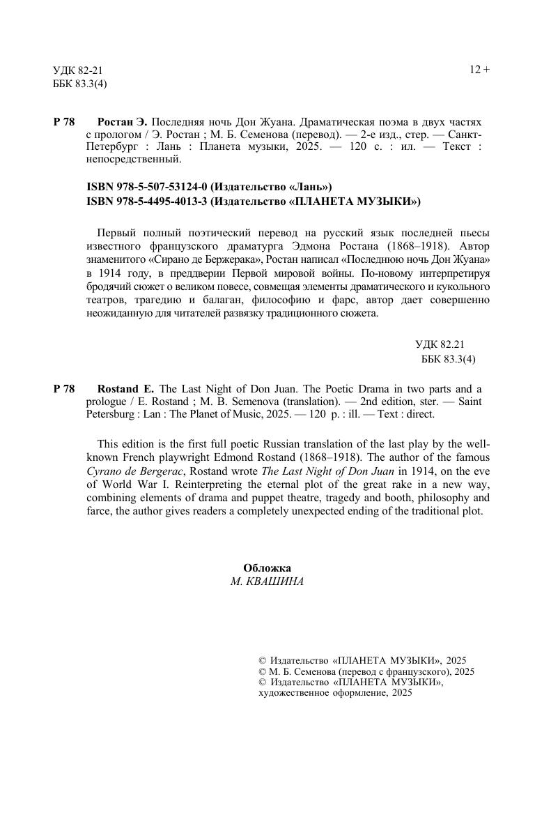 Первый полный поэтический перевод на русский язык последней пьесы известного французского драматурга Эдмона Ростана (1868–1918). Автор знаменитого «Сирано де Бержерака», Ростан написал «Последнюю ночь Дон Жуана» в 1914 году, в преддверии Первой мировой войны. По-новому интерпретируя бродячий сюжет о великом повесе, совмещая элементы драматического и кукольного театров, трагедию и балаган, философию и фарс, автор дает совершенно неожиданную для читателей развязку традиционного сюжета. This edition is the first full poetic Russian translation of the last play by the well-known French playwright Edmond Rostand (1868–1918). The author of the famous Cyrano de Bergerac, Rostand wrote The Last Night of Don Juan in 1914, on the eve of World War I. Reinterpreting the eternal plot of the great rake in a new way, combining elements of drama and puppet theatre, tragedy and booth, philosophy and farce, the author gives readers a completely unexpected ending of the traditional plot.