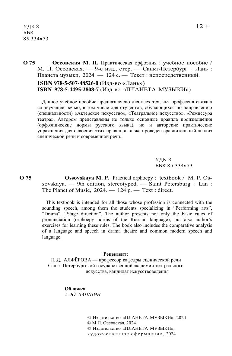 Данное учебное пособие предназначено для всех тех, чья профессия связана со звучащей речью, для студентов высших и среднеспециальных театральных учебных заведений. Автором представлены не только основные правила произношения (орфоэпические нормы русского языка), но и авторские практические упражнения для освоения этих правил, а также проведен сравнительный анализ сценической речи и современной речи. This textbook is intended for all those whose profession is connected with the sounding speech, among them the students specializing in “Performing arts”, “Drama”, “Stage direction”. The author presents not only the basic rules of pronunciation (orphoepy norms of the Russian language), but also author’s exercises for learning these rules. The book also includes the comparative analysis of a language and speech in drama theatre and common modern speech and language.