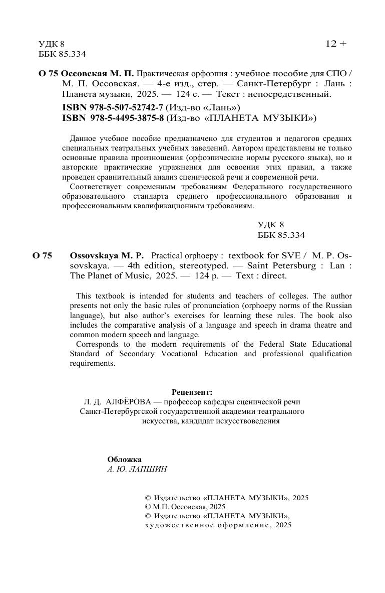 Данное учебное пособие предназначено для студентов и педагогов средних специальных театральных учебных заведений. Автором представлены не только основные правила произношения (орфоэпические нормы русского языка), но и авторские практические упражнения для освоения этих правил, а также проведен сравнительный анализ сценической речи и современной речи. Соответствует современным требованиям Федерального государственного образовательного стандарта среднего профессионального образования и профессиональным квалификационным требованиям. This textbook is intended for students and teachers of colleges. The author presents not only the basic rules of pronunciation (orphoepy norms of the Russian language), but also author’s exercises for learning these rules. The book also includes the comparative analysis of a language and speech in drama theatre and common modern speech and language. Corresponds to the modern requirements of the Federal State Educational Standard of Secondary Vocational Education and professional qualification requirements.