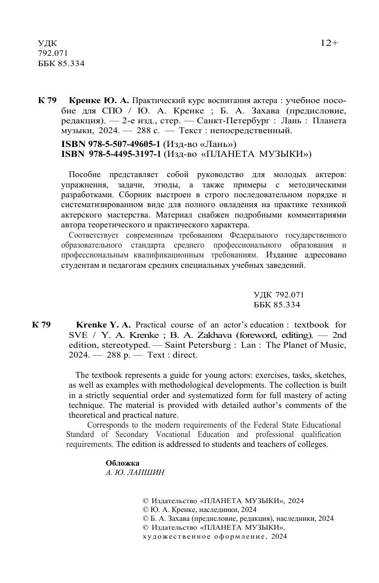 Пособие представляет собой руководство для молодых актеров: упражнения, задачи, этюды, а также примеры с методическими разработками. Сборник выстроен в строго последовательном порядке и систематизированном виде для полного овладения на практике техникой актерского мастерства. Материал снабжен подробными комментариями автора теоретического и практического характера. Издание адресовано студентам и педагогам средних специальных учебных заведений. The textbook represents a guide for young actors: exercises, tasks, sketches, as well as examples with methodological developments. The collection is built in a strictly sequential order and systematized form for full mastery of an acting technique. The material is provided with detailed author’s comments of the theoretical and practical nature. The edition is addressed to students and teachers of colleges.