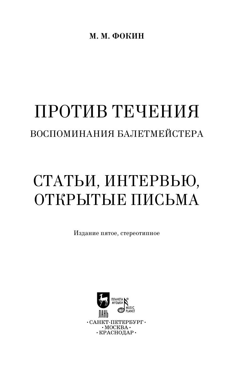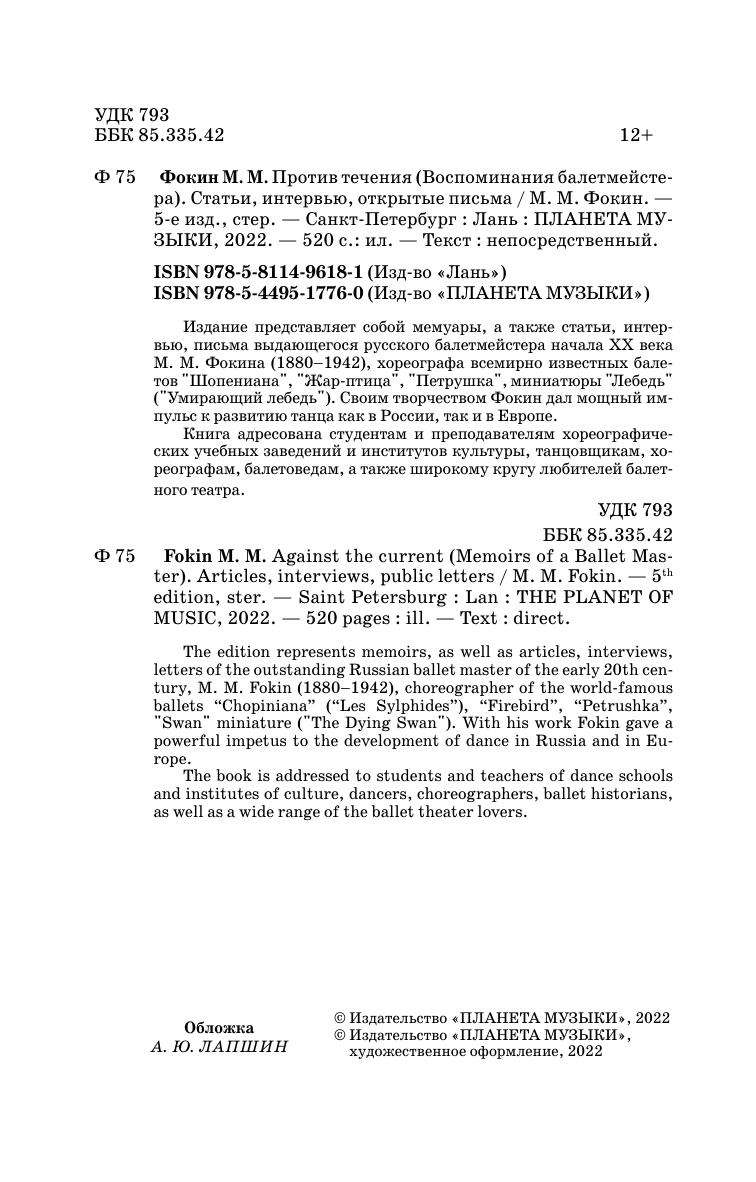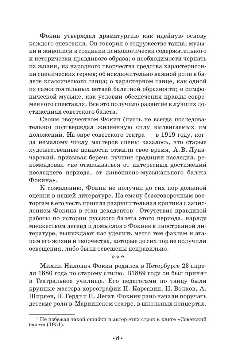 The edition represents memoirs, as well as articles, interviews, letters of the outstanding Russian ballet master of the early 20th century, M. M. Fokin (1880–1942), choreographer of the world-famous ballets “Chopiniana” (“Les Sylphides”), “Firebird”, “Petrushka”, "Swan" miniature ("The Dying Swan"). With his work Fokin gave a powerful impetus to the development of dance in Russia and in Europe.