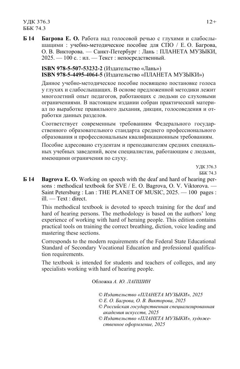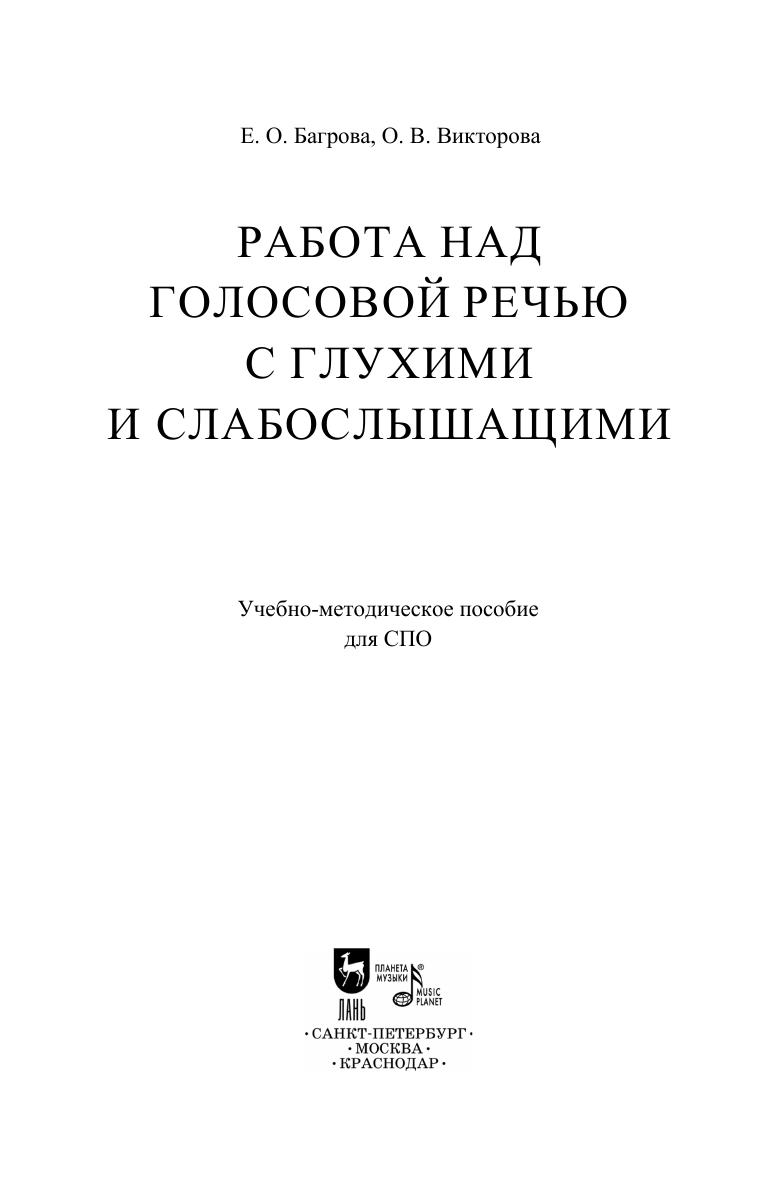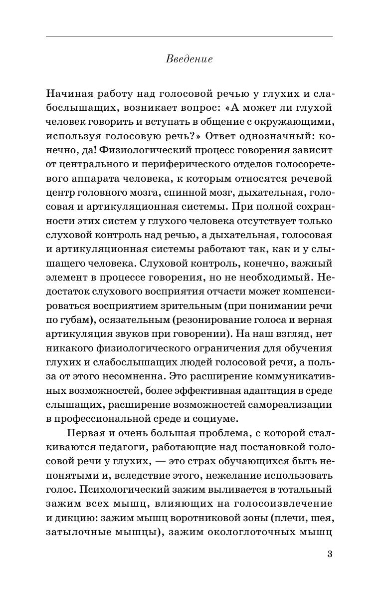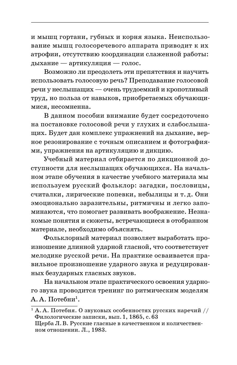 Данное учебно-методическое пособие посвящено постановке голоса у глухих и слабослышащих. В основе предложенной методики лежит многолетний опыт педагогов, работающих с людьми со слуховыми ограничениями. В настоящем издании собран практический материал по выработке правильного дыхания, дикции, голосоведения и отработки данных разделов. Соответствует современным требованиям Федерального государственного образовательного стандарта среднего профессионального образования и профессиональным квалификационным требованиям. Пособие адресовано студентам и преподавателям средних специальных учебных заведений, всем специалистам, работающим с людьми, имеющими ограничения по слуху. This methodical textbook is devoted to speech training for the deaf and hard of hearing persons. The methodology is based on the authors’ long experience of working with hard of heraing people. This edition contains practical tools on training the correct breathing, diction, voice leading and mastering these sections. Corresponds to the modern requirements of the Federal State Educational Standard of Secondary Vocational Education and professional qualification requirements. The textbook is intended for students and teachers of colleges, and any specialists working with hard of hearing people.