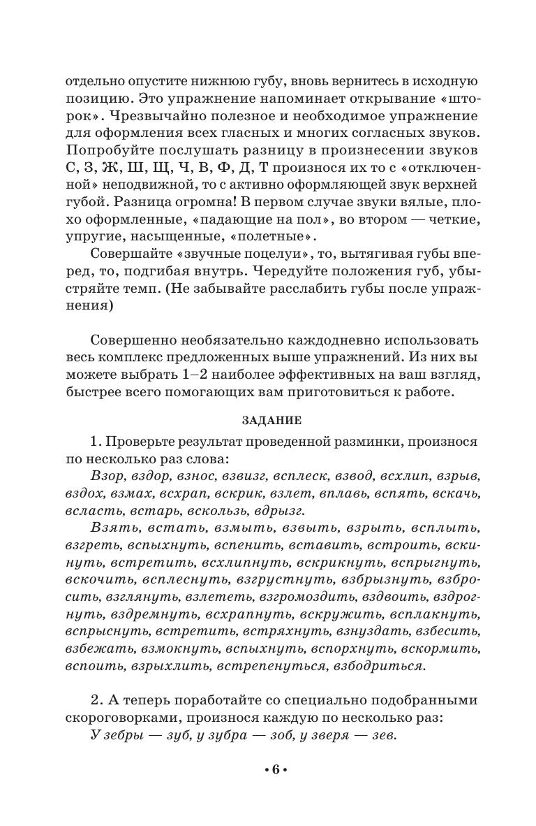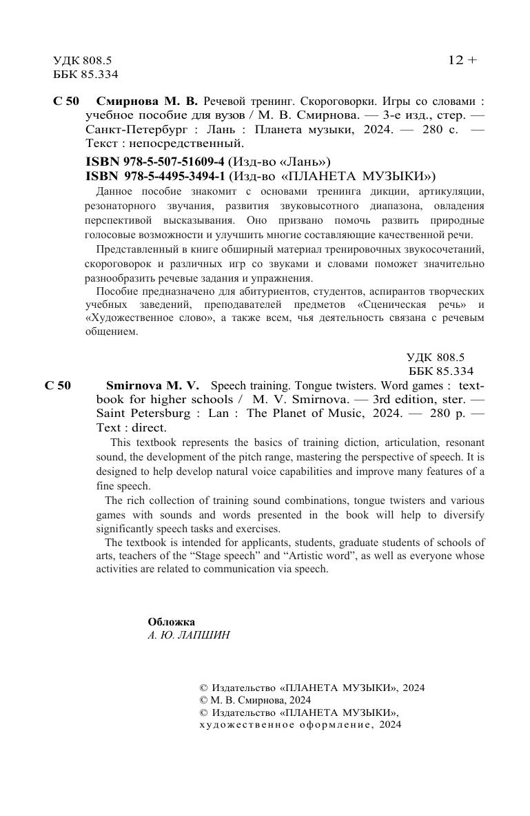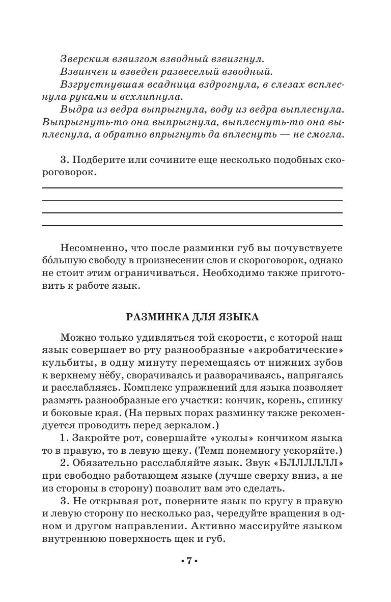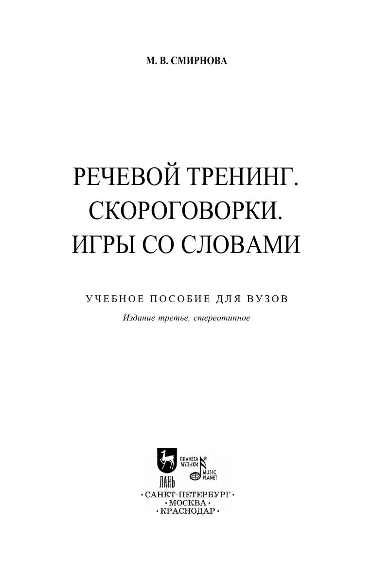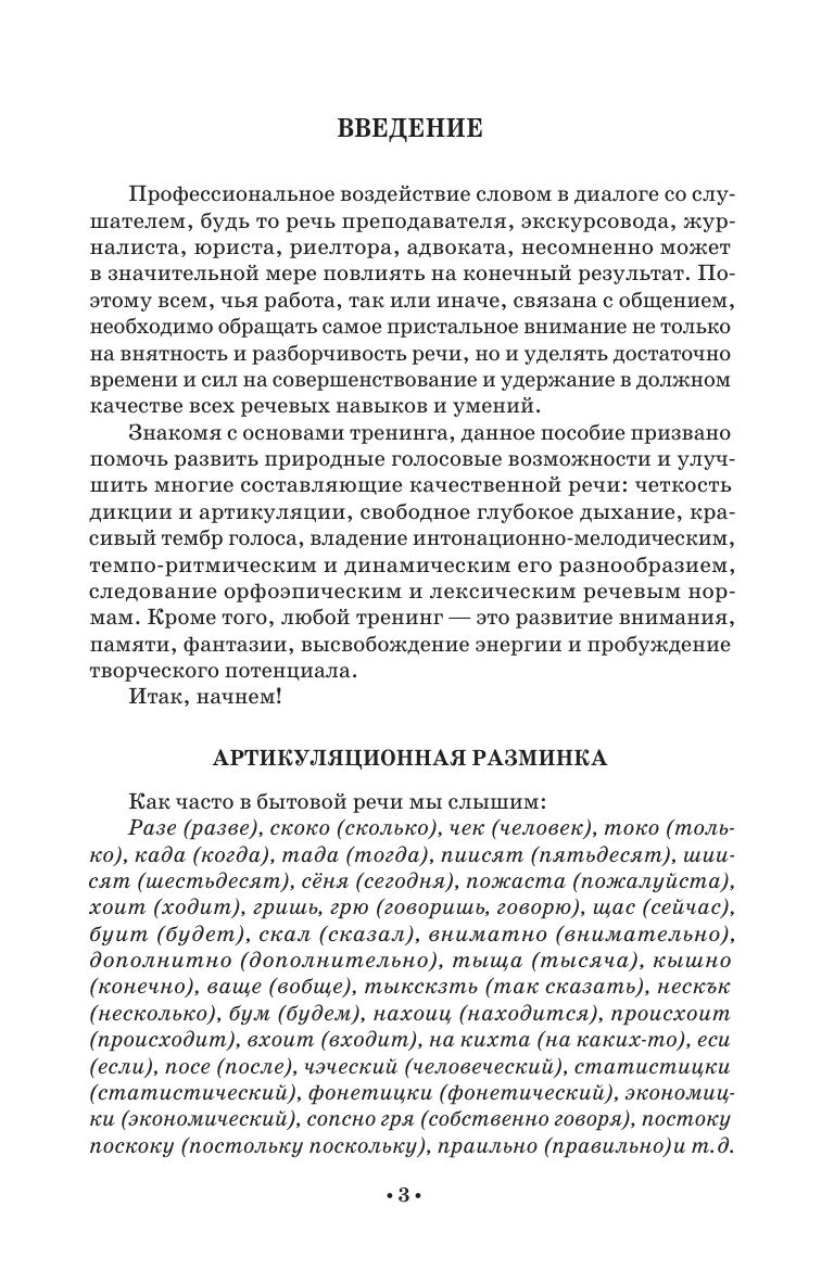 Данное пособие знакомит с основами тренинга дикции, артикуляции, резонаторного звучания, развития звуковысотного диапазона, овладения перспективой высказывания. Оно призвано помочь развить природные голосовые возможности и улучшить многие составляющие качественной речи. Представленный в книге обширный материал тренировочных звукосочетаний, скороговорок и различных игр со звуками и словами поможет значительно разнообразить речевые задания и упражнения. Пособие предназначено для абитуриентов, студентов, аспирантов творческих учебных заведений, преподавателей предметов «Сценическая речь» и «Художественное слово», а также всем, чья деятельность связана с речевым общением. This textbook represents the basics of training diction, articulation, resonant sound, the development of the pitch range, mastering the perspective of speech. It is designed to help develop natural voice capabilities and improve many features of a fine speech. The rich collection of training sound combinations, tongue twisters and various games with sounds and words presented in the book will help to diversify significantly speech tasks and exercises. The textbook is intended for applicants, students, graduate students of schools of arts, teachers of the “Stage speech” and “Artistic word”, as well as everyone whose activities are related to communication via speech.