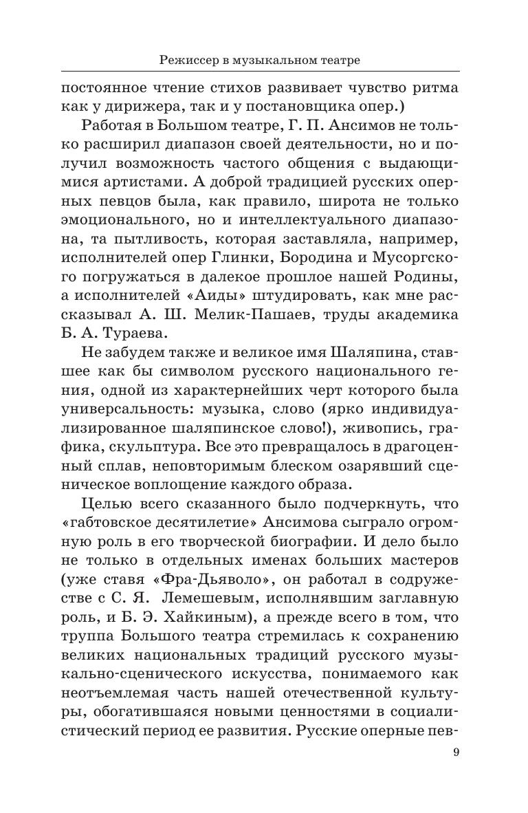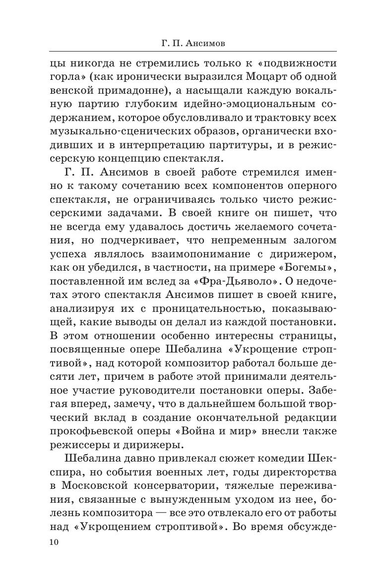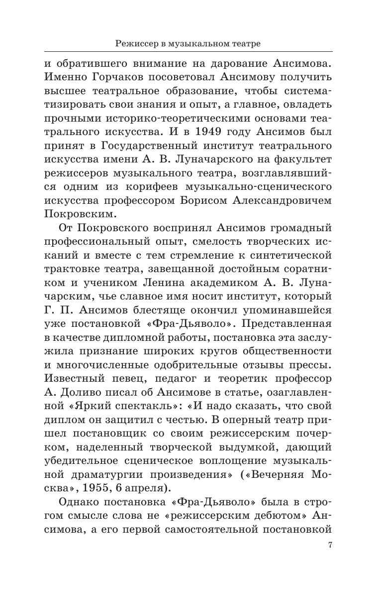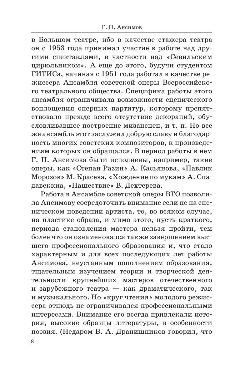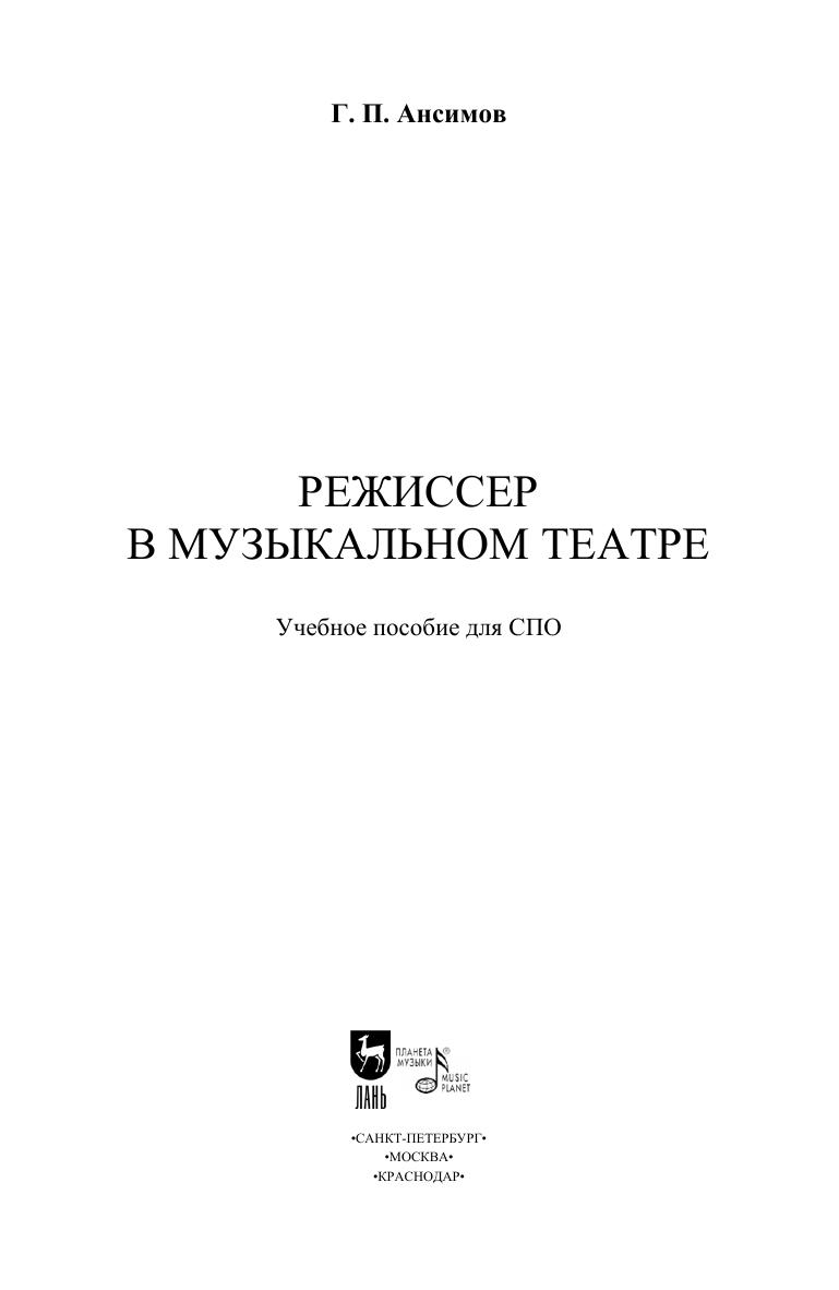 Георгий Павлович Ансимов (1922–2015) — одна из вершин мировой оперно-музыкальной режиссуры. За свою творческую жизнь поставил более ста спектаклей — в России, СССР, Чехии, Австрии, Германии, Китае, Корее, в Прибалтике. С 1954 года преподавал в ГИТИСе, воспитав целую плеяду выдающихся мастеров музыкального театра, его ученики и по сей день блистают на сценах самых знаковых театров мира. Настоящая книга, жанр которой не так легко определить, приоткрывает завесу творческой деятельности режиссера, повествующего в увлекательной манере о своей работе в музыкальном театре. Автор делится размышлениями, воспоминаниями, меткими аналитическими наблюдениями о постановках «Фра-Дьяволо», «Укрощение строптивой», «Орфей в аду», «Фиалка Монмартра», «Война и мир» и др. Соответствует современным требованиям Федерального государственного образовательного стандарта среднего профессионального образования и профессиональным квалификационным требованиям. Пособие предназначено для студентов и преподавателей средних специальных учебных заведений. Georgy Pavlovich Ansimov (1922–2015) is one of the world’s most prominent opera and music directors. Throughout his career, he staged more than a hundred performances in Russia, the USSR, the Czech Republic, Austria, Germany, China, Korea, and the Baltics. Since 1954, he taught at GITIS, having trained a galaxy of outstanding masters of music theatre, his students still shine on the stages of the world’s most iconic theatres. This book, the genre of which is not so easy to define, lifts the curtain on the director’s method. In a fascinating manner he tells about his work in the music theatre. The author shares his thoughts, memories, keen analytical observations on the productions of Fra Diavolo, The Taming of the Shrew, Orpheus in the Underworld, The Violet of Montmartre, War and Peace and others. Corresponds to the modern requirements of the Federal State Educational Standard of Secondary Vocational Education and professional qualification requirements.The textbook is intended for teachers and students of colleges.