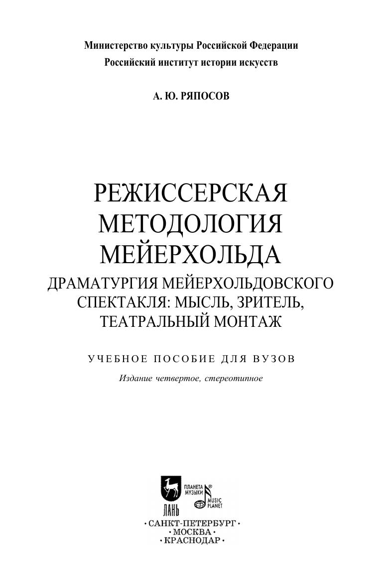 Книга посвящена изучению режиссерской методологии В. Э. Мейерхольда в той ее грани, что связана с принципами формирования режиссерского сюжета спектакля. Предметом исследования выступают монтажные методы структурирования действия, когда для постановки берутся пьесы, написанные по одним драматургическим законам, а композиция спектакля выстраиваются на основе других драматургических принципов, главным образом монтажных. Проблема использования монтажных приемов в сценическом искусстве Мастера изучается в неотрывной связи с другими составляющими театральной системы Мейерхольда, взятой как целое. Книга адресована историкам русского театра 1920-х – 1930-х годов, преподавателям театральных ВУЗов, аспирантам, режиссерам-практикам и театральным художникам-постановщикам. The book is devoted to the study of V. E. Meyerhold’s directing methodology, the part, which is connected with the principles of forming the director’s plot of the play. The subject of the study is the montage methods of structuring the action, when the plays written according to same drama laws are taken for staging, and the composition of the performance is built on the basis of other dramatic principles, mainly montage ones. The problem of using montage techniques in the Master’s stage art is studied in close connection with other components of Meyerhold’s theatrical system, taken as a whole. The book is addressed to historians of the Russian theater of the 1920s and 1930s, educators at theater higher schools, graduate students, theater directors and theater production designers.