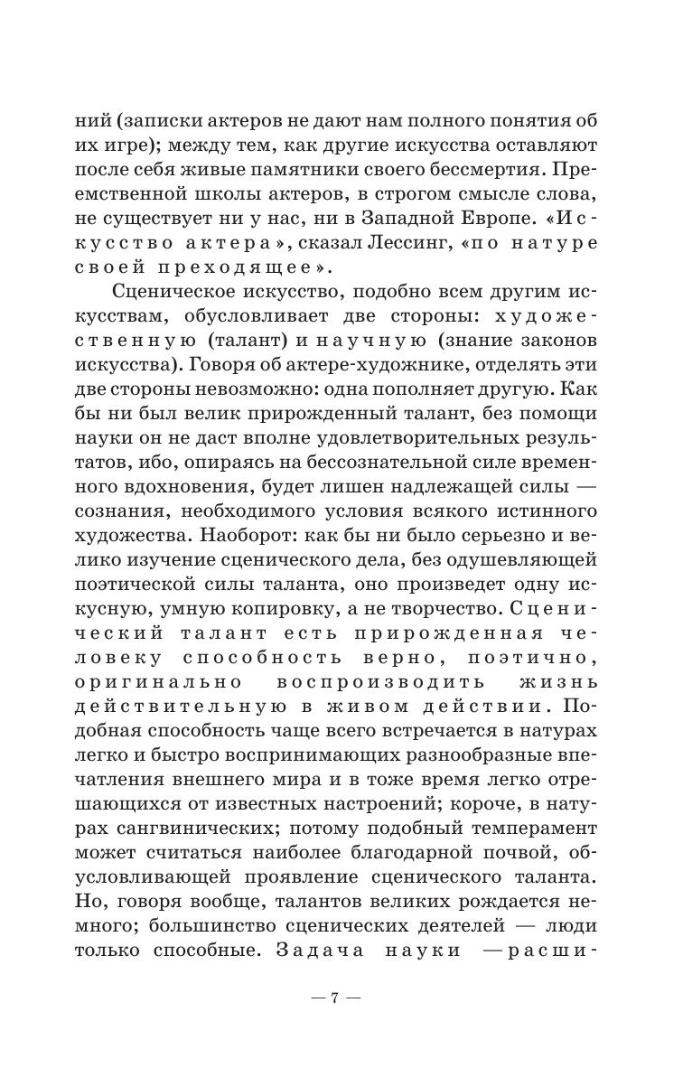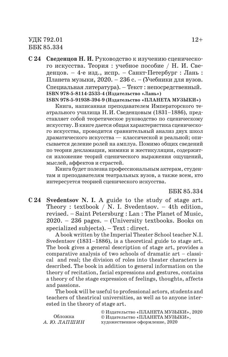 Книга, написанная преподавателем Императорского театрального училища Н. И. Сведенцовым (1831–1886), представляет собой теоретическое руководство по сценическому искусству. В книге дается общая характеристика сценического искусства, проводится сравнительный анализ двух школ драматического искусства — классической и реальной; описывается деление ролей на амплуа. Помимо общих сведений по теории декламации, мимики и жестикуляции, содержится изложение теорий сценического выражения ощущений, мыслей, аффектов и страстей.