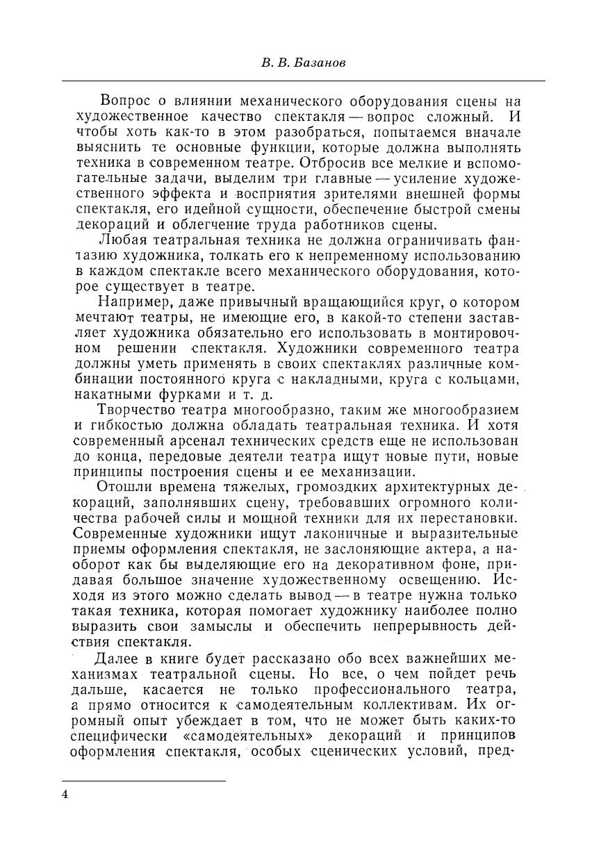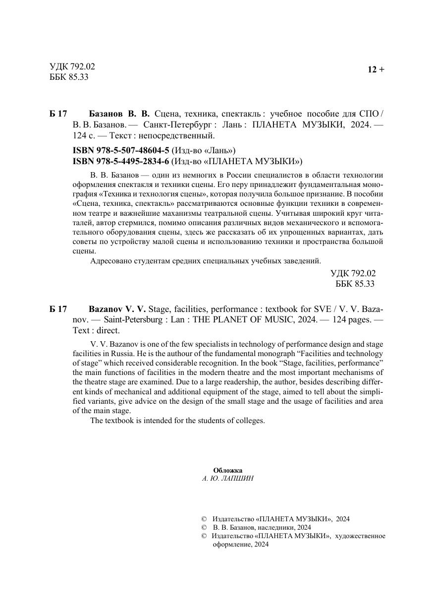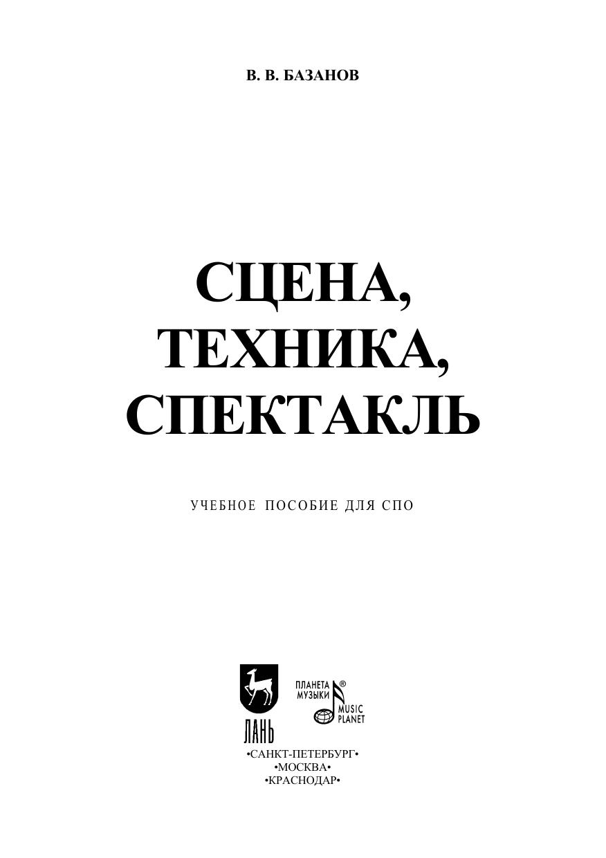 В. В. Базанов — один из немногих в России специалистов в области технологии оформления спектакля и техники сцены. Его перу принадлежит фундаментальная монография «Техника и технология сцены», которая получила большое признание. В пособии "Сцена, техника, спектакль" рассматриваются основные функции техники в современном театре и важнейшие маханизмы театральной сцены. Учитывая широкий круг читаталей, автор стермился, помимио описания различных видов механичестического и вспомогательного оборудования сцены, здесь же рассказать об их упрощенных вариантах, дать советы по устройству малой сцены и использованию техники и пространства большой сцены. Соответствует современным требованиям Федерального государственного образовательного стандарта среднего профессионального образования и профессиональным квалификационным требованиям. Адресовано студентам средних специальных учебных заведений. V. V. Bazanov is one of the few specialists in technology of performance design and stage facilities in Russia. He is the authour of the fundamental monograph “Facili-ties and technology of stage” which received considerable recognition. In the book “Stage, facilities, performance” the main functions of facilities in the modern theatre and the most important mechanisms of the theatre stage are examined. Due to a large readership, the author, besides describing different kinds of mechanical and addition-al equipment of the stage, aimed to tell about the simplified variants, give advice on the design of the small stage and the usage of facilities and area of the main stage. The textbook is intended for the students of colleges.
