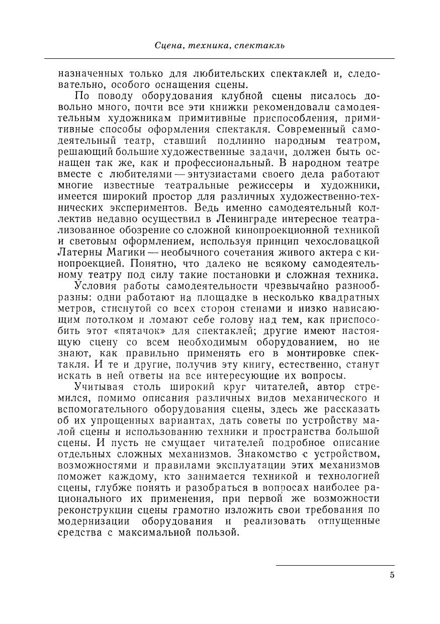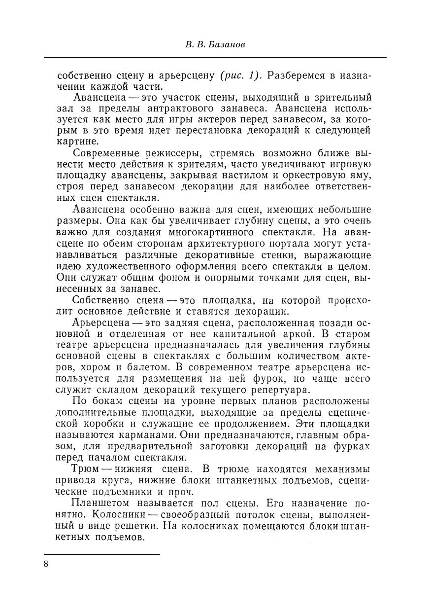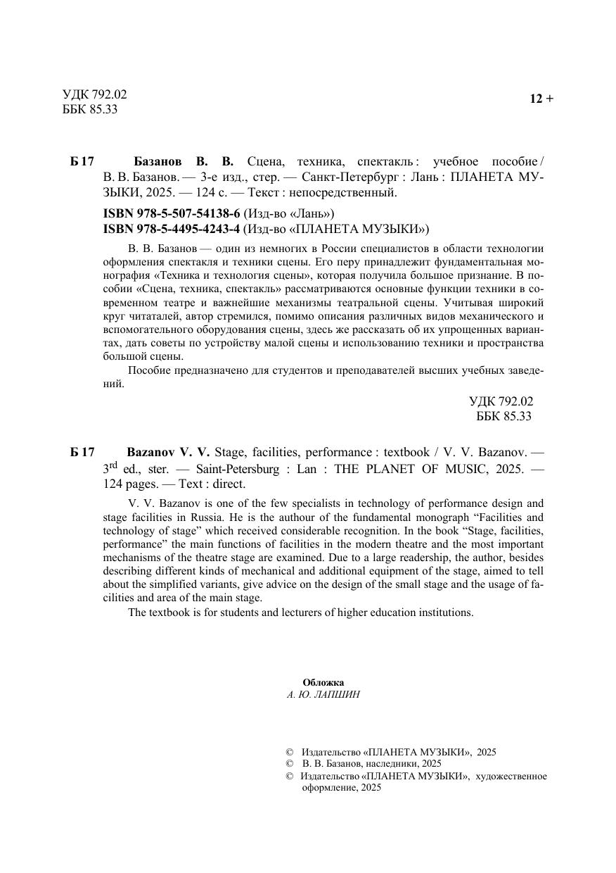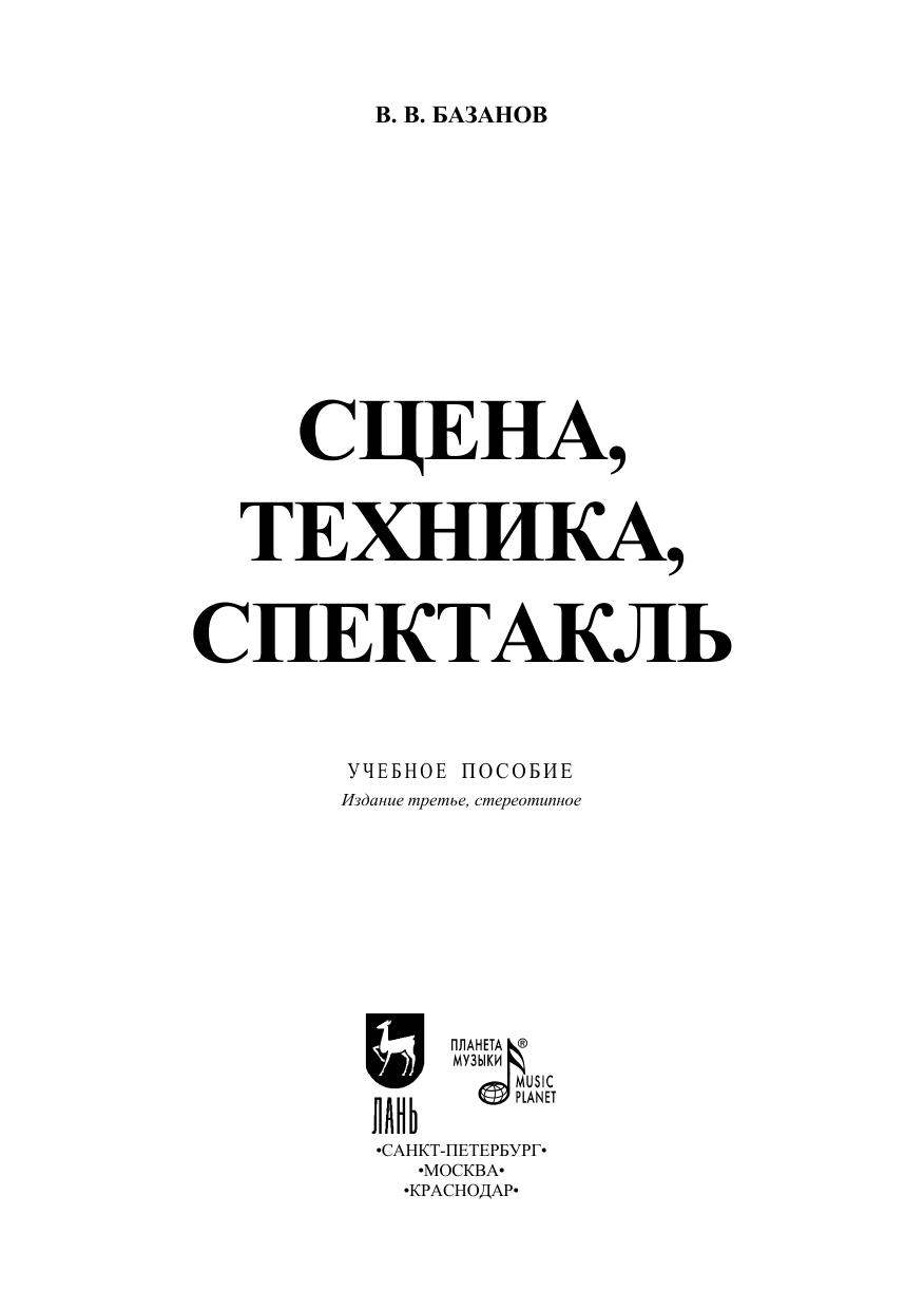 В. В. Базанов — один из немногих в России специалистов в области технологии оформления спектакля и техники сцены. Его перу принадлежит фундаментальная мо-нография «Техника и технология сцены», которая получила большое признание. В по-собии «Сцена, техника, спектакль» рассматриваются основные функции техники в со-временном театре и важнейшие механизмы театральной сцены. Учитывая широкий круг читаталей, автор стремился, помимо описания различных видов механического и вспомогательного оборудования сцены, здесь же рассказать об их упрощенных вари-антах, дать советы по устройству малой сцены и использованию техники и простран-ства большой сцены. Пособие предназначено для студентов и преподавателей высших учебных заве-дений. V. V. Bazanov is one of the few specialists in technology of performance design and stage facilities in Russia. He is the authour of the fundamental monograph “Facilities and technology of stage” which received considerable recognition. In the book “Stage, facilities, performance” the main functions of facilities in the modern theatre and the most important mechanisms of the theatre stage are examined. Due to a large readership, the author, besides describing different kinds of mechanical and additional equipment of the stage, aimed to tell about the simplified variants, give advice on the design of the small stage and the usage of facilities and area of the main stage. The textbook is for students and lecturers of higher education institutions.