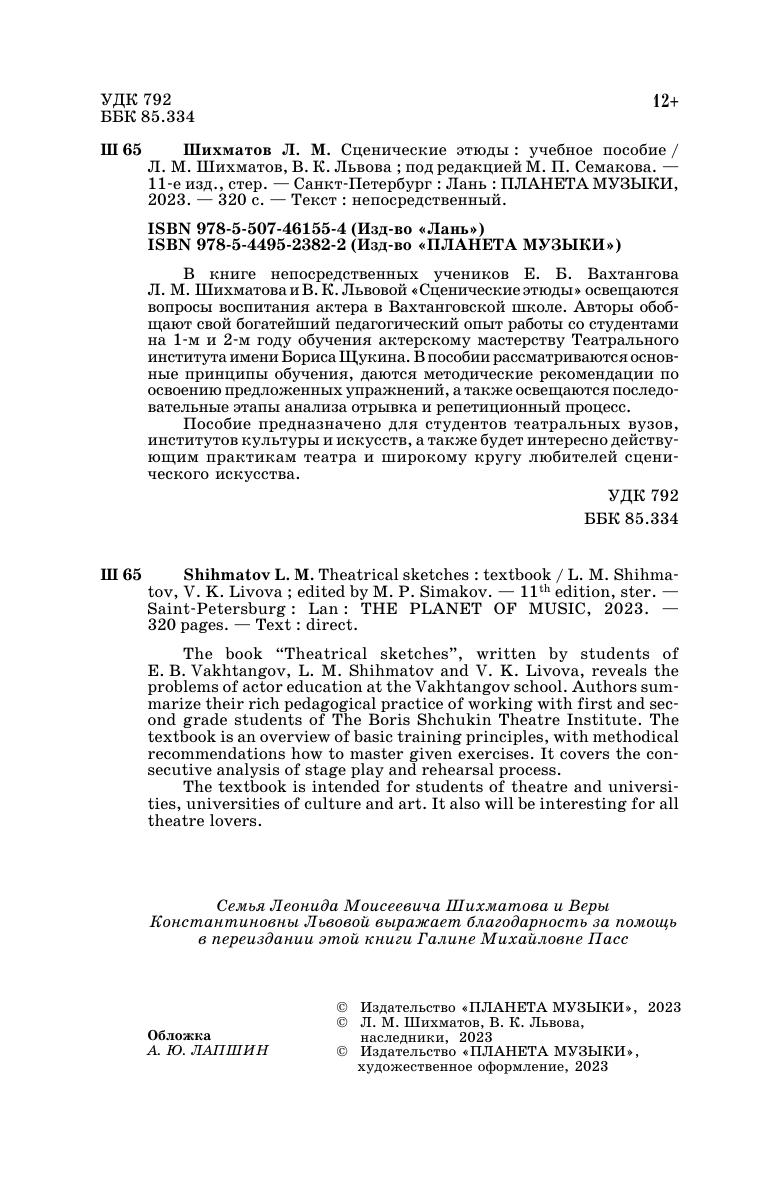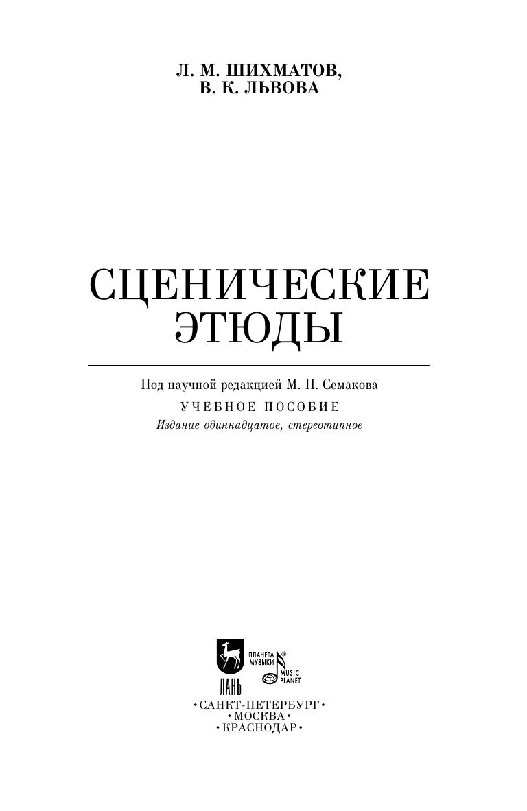 В книге непосредственных учеников Е. Б. Вахтангова Л. М. Шихматова и В. К. Львовой «Сценические этюды» освещаются вопросы воспитания актера в Вахтанговской школе. Авторы обобщают свой богатейший педагогический опыт работы со студентами на 1 -м и 2-м году обучения актерскому мастерству Театрального института имени Бориса Щукина. В пособии рассматриваются основные принципы обучения, даются методические рекомендации по освоению предложенных упражнений, а так же освещаются последовательные этапы анализа отрывка и репетиционный процесс.