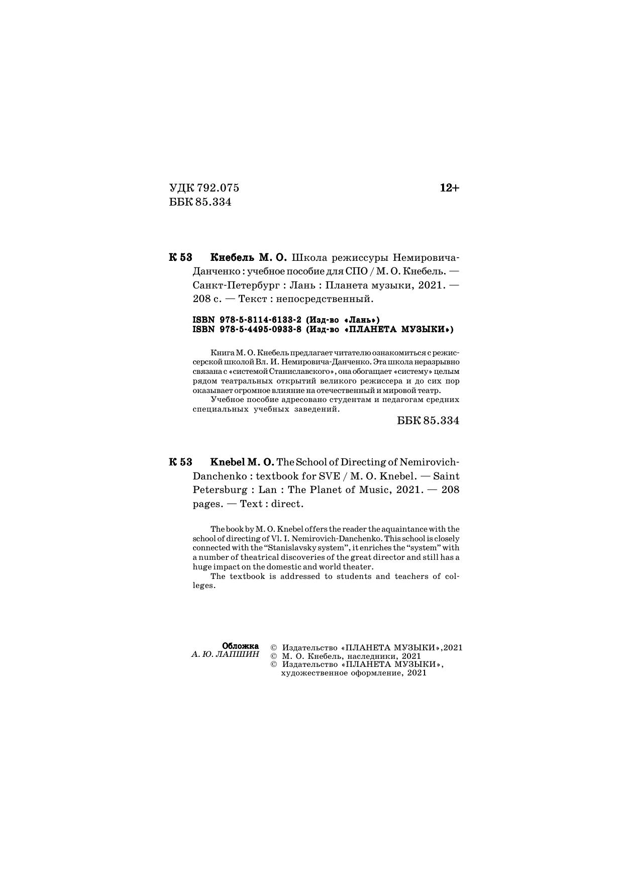 Книга М. О.Кнебель предлагает читателю ознакомиться с режиссерской школой В. И. Немировича-Данченко. Эта школа неразрывно связана с "системой Станиславского", она обогащает "систему" целым рядом театральных открытий великого режиссера и до сих пор оказывает огромное влияние на отечественный и мировой театр. Учебное пособие адресовано студентам и педагогам средних специальных учебных заведений.