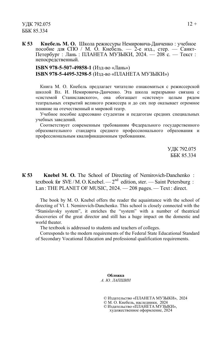 Книга М.О.Кнебель предлагает читателю ознакомиться с режиссерской школой Вл.И.Немировича-Данченко. Эта школа неразрывно связана с системой Станиславского, она обогащает систему целым рядом театральных открытий великого режиссера и до сих пор оказывает огромное влияние на отечественный и мировой театр. Учебное пособие адресовано студентам и педагогам средних специальных учебных заведений. The book by M. O. Knebel offers the reader the aqcuaintance with the school of directing of Vl. I. Nemirovich-Danchenko. This school is closely connected with the Stanislavsky system, it enriches the system with a number of theatrical discoveries of the great director and still has a huge impact on the domestic and world theater. The textbook is addressed to students and teachers of colleges.