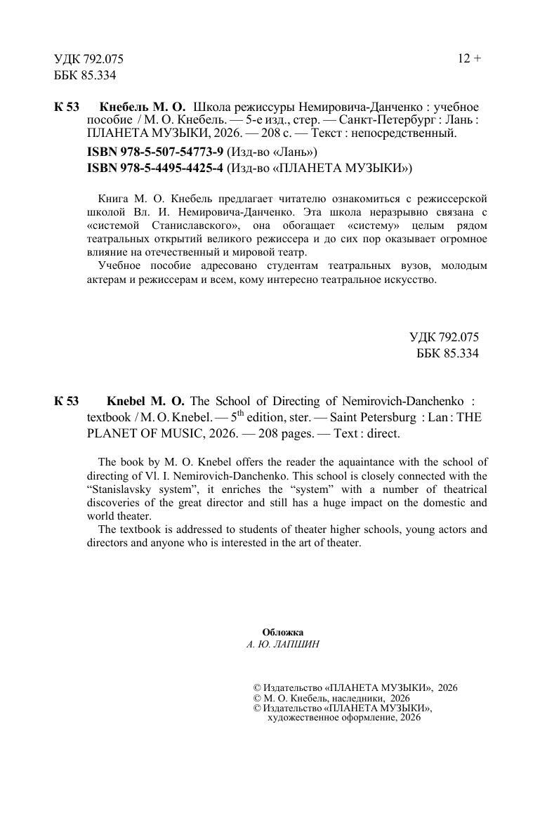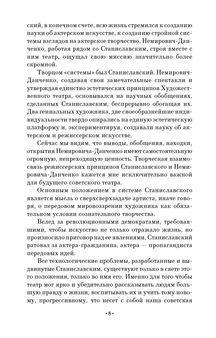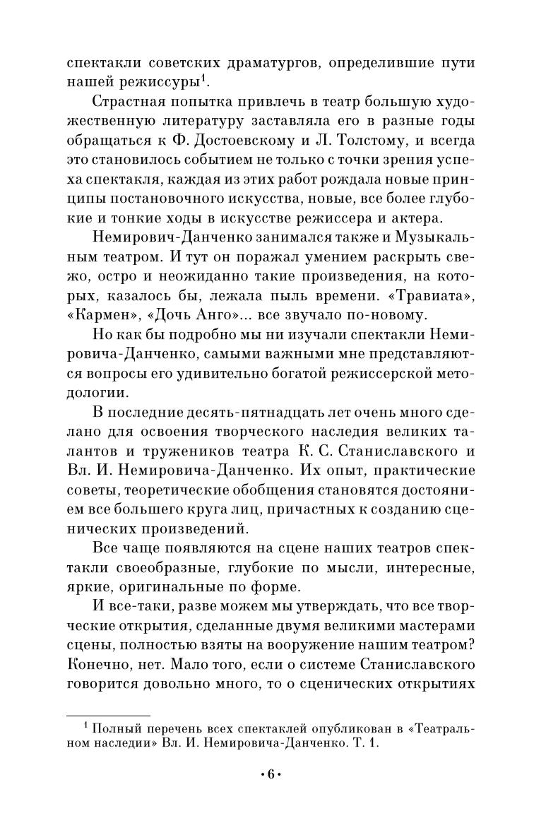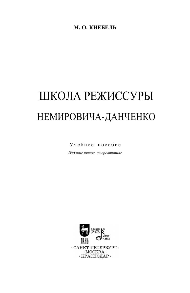 Книга М.О.Кнебель предлагает читателю ознакомиться с режиссерской школой Вл.И.Немировича-Данченко. Эта школа неразрывно связана с "системой Станиславского", она обогащает "систему" целым рядом театральных открытий великого режиссера и до сих пор оказывает огромное влияние на отечественный и мировой театр. Учебное пособие адресовано студентам театральных вузов, молодым актерам и режиссерам и всем, кому интересно театральное искусство. The book by M. O. Knebel offers the reader the aqcuaintance with the school of directing of Vl. I. Nemirovich-Danchenko. This school is closely connected with the "Stanislavsky system", it enriches the "system" with a number of theatrical discoveries of the great director and still has a huge impact on the domestic and world theater. The textbook is addressed to students of theater high schools, young actors and directors and everyone who is interested in the art of theatre.