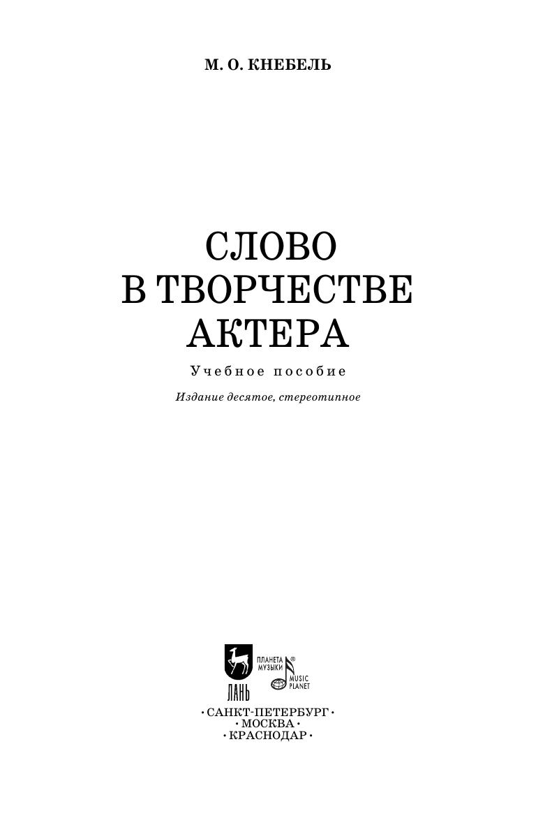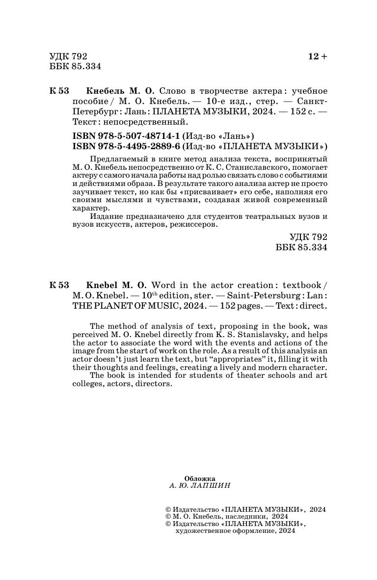 Предлагаемый в книге метод анализа текста, воспринятый М. О. Кнебель непосредственно от К. С. Станиславского, помогает актеру с самого начала работы над ролью связать слово с событиями и действиями образа. В результате такого анализа актер не просто заучивает текст, но как бы «присваивает» его себе, наполняя его своими мыслями и чувствами, создавая живой современный характер. Издание предназначено для студентов театральных вузов и вузов искусств, актеров, режиссеров. The method of analysis jf text, proposing in the book, was perceived M. O. Knebel directly from K. S. Stanislavsky, and helps the actor to associate the word with the events and actions of the image from the start of work on the role. As a result of this analysis an actor doesn’t just learn the text, but "appropriates" it, filling it with their thoughts and feelings, creating a lively and modern character. The book is intended for students of theater schools and art colleges, actors, directors.