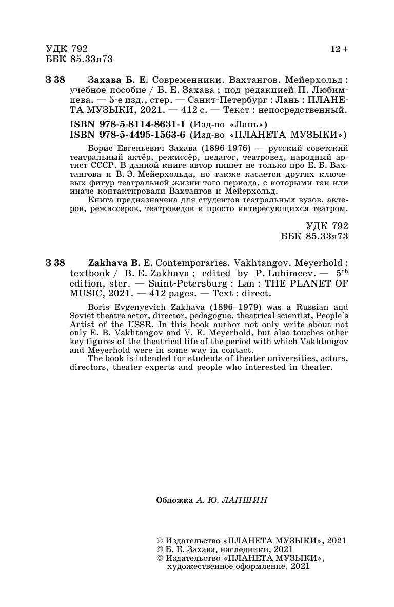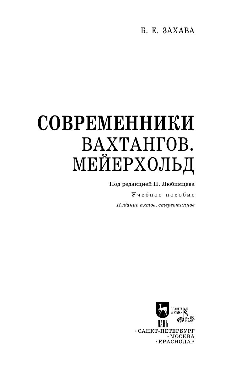 Boris Evgenyevich Zakhava (1896–1979) was a Russian and Soviet theatre actor, director, pedagogue, theatrical scientist, People's Artist of the USSR. In this book author not only write about not only E. B. Vakhtangov and V. E. Meyerhold, but also touches other key figures of the theatrical life of the period with which Vakhtangov and Meyerhold were in some way in contact.