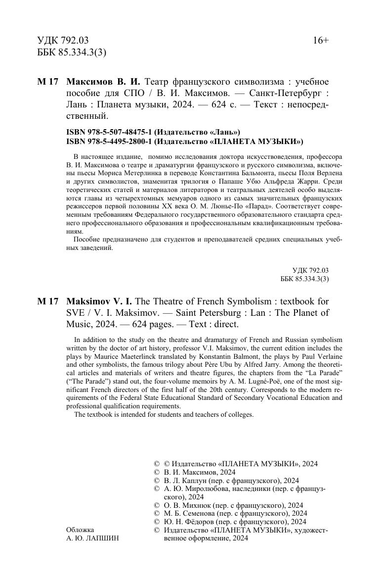 В настоящее издание, помимо исследования доктора искусствоведения, профессора В. И. Максимова о театре и драматургии французского и русского символизма, включены пьесы Мориса Метерлинка в переводе Константина Бальмонта, пьесы Поля Верлена и других символистов, знаменитая трилогия о Папаше Убю Альфреда Жарри. Среди теоретических статей и материалов литераторов и театральных деятелей особо выделяются главы из четырехтомных мемуаров одного из самых значительных французских режиссеров первой половины ХХ века О. М. Люнье-По "Парад". Соответствует современным требованиям Федерального государственного образовательного стандарта среднего профессионального образования и профессиональным квалификационным требованиям. Пособие предназначено для студентов и преподавателей средних специальных учебных заведений. In addition to the study on the theatre and dramaturgy of French and Russian symbolism written by the doctor of art history, professor V.I. Maksimov, the current edition includes the plays by Maurice Maeterlinck translated by Konstantin Balmont, the plays by Paul Verlaine and other symbolists, the famous trilogy about Père Ubu by Alfred Jarry. Among the theoreti-cal articles and materials of writers and theatre figures, the chapters from the “La Parade” (“The Parade”) stand out, the four-volume memoirs by A. M. Lugné-Poё, one of the most sig-nificant French directors of the first half of the 20th century. Corresponds to the modern re-quirements of the Federal State Educational Standard of Secondary Vocational Education and professional qualification requirements. The textbook is intended for students and teachers of colleges.