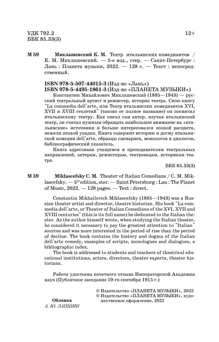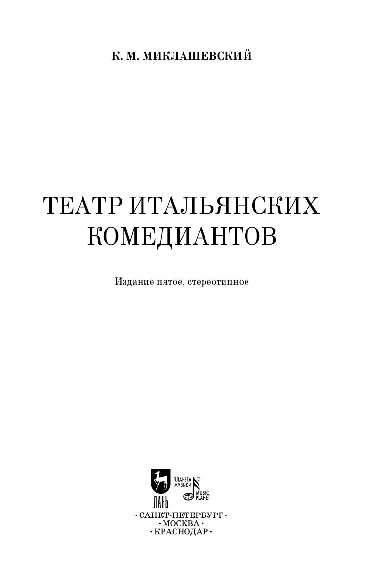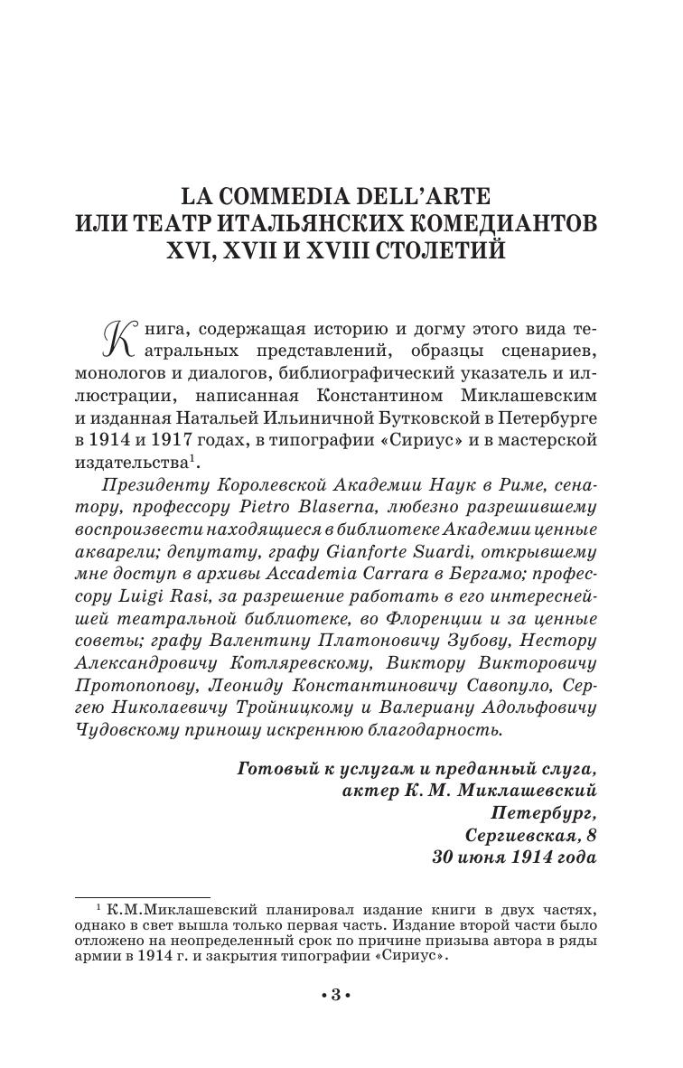 Константин Михайлович Миклашевский (1885 — 1943) - русский театральный артист и режиссер, историк театра. Свою книгу "La commedia dell'arte, или Театр итальянских комедиантов XVI, XVII и XVIII столетий" (таково ее полное название) он посвятил итальянскому театру. Как писал сам автор, изучая итальянский театр, он считал нужным обращать наибольшее внимание на «итальянские» источники и больше интересовался эпохой расцвета, нежели эпохой упадка. Книга содержит историю и догму итальянской комедии dell'arte, образцы сценариев, монологов и диалогов, библиографический указатель.