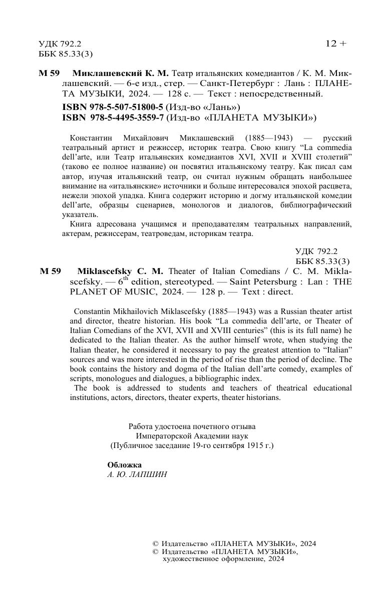 Константин Михайлович Миклашевский (1885 — 1943) - русский театральный артист и режиссер, историк театра. Свою книгу "La commedia dell'arte, или Театр итальянских комедиантов XVI, XVII и XVIII столетий" (таково ее полное название) он посвятил итальянскому театру. Как писал сам автор, изучая итальянский театр, он считал нужным обращать наибольшее внимание на «итальянские» источники и больше интересовался эпохой расцвета, нежели эпохой упадка. Книга содержит историю и догму итальянской комедии dell'arte, образцы сценариев, монологов и диалогов, библиографический указатель. Книга адресована учащимся и преподавателям театральных направлений, актерам, режиссерам, театроведам, историкам театра.
