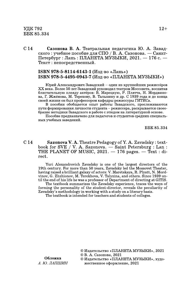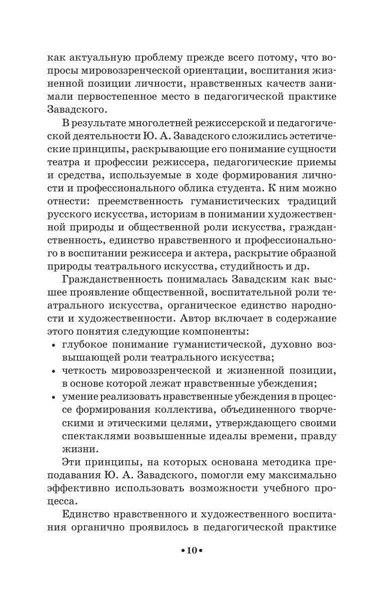 Юрий Александрович Завадский – один из крупнейших режиссёров XX века. Более 50 лет Завадский руководил театром Моссовета, воспитав блистательную плеяду актёров: В. Марецкую, Р. Плятта, Н. Мордвинова, Г. Жжёнова, М. Терехову, В. Талызину и др. С 1939 года и до конца своей жизни он был профессором кафедры режиссуры ГИТИСа. В пособии обобщается опыт работы Завадского, прослеживаются пути формирования личности студента – режиссера, раскрывается своеобразие методики Завадского в работе с этюдом на литературной основе. Пособие предназначено для педагогов и студентов средних специальных учебных заведений.