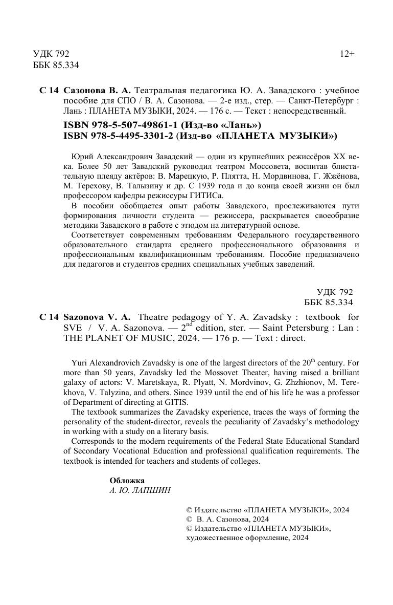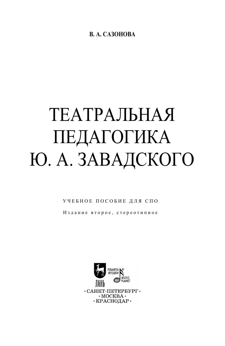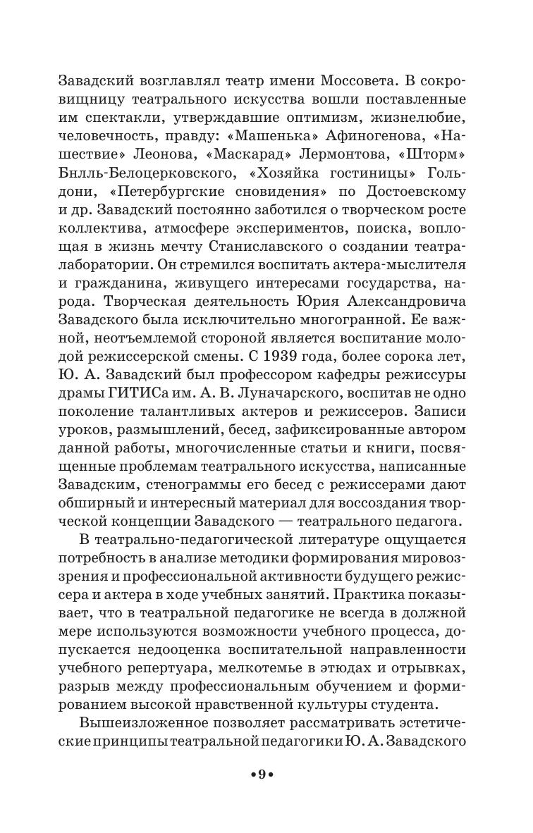 Юрий Александрович Завадский – один из крупнейших режиссёров XX века. Более 50 лет Завадский руководил театром Моссовета, воспитав блистательную плеяду актёров: В. Марецкую, Р. Плятта, Н. Мордвинова, Г. Жжёнова, М. Терехову, В. Талызину и др. С 1939 года и до конца своей жизни он был профессором кафедры режиссуры ГИТИСа. В пособии обобщается опыт работы Завадского, прослеживаются пути формирования личности студента – режиссера, раскрывается своеобразие методики Завадского в работе с этюдом на литературной основе. Пособие предназначено для педагогов и студентов средних специальных учебных заведений. Yuri Alexandrovich Zavadsky is one of the largest directors of the XX century. For more than 50 years, Zavadsky led the Mossovet Theater, having raised a brilliant galaxy of actors: V. Maretskaya, R. Plyatt, N. Mordvinov, G. Zhzhionov, M. Terekhova, V. Talyzina, and others. Since 1939 until the end of his life he was a professor of Department of directing at GITIS. The textbook summarizes the Zavadsky experience, traces the ways of forming the personality of the student-director, reveals the peculiarity of Zavadsky's methodology in working with a study on a literary basis. The textbook is intended for teachers and students of colleges.