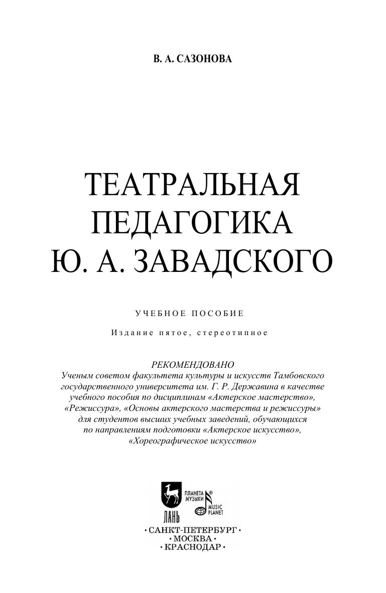 Юрий Александрович Завадский – один из крупнейших режиссёров XX века. Более 50 лет Завадский руководил театром Моссовета, воспитав блистательную плеяду актёров: В. Марецкую, Р. Плятта, Н. Мордвинова, Г. Жжёнова, М. Терехову, В. Талызину и др. С 1939 года и до конца своей жизни он был профессором кафедры режиссуры ГИТИСа. В пособии обобщается опыт работы Завадского, прослеживаются пути формирования личности студента – режиссера, раскрывается своеобразие методики Завадского в работе с этюдом на литературной основе. Пособие предназначено для преподавателей и студентов вузов, обучающихся по направлениям подготовки «Актерское искусство», «Хореографическое искусство» (по дисциплинам «Актерское мастерство», «Режиссура», «Основы актерского мастерства и режиссуры») , театральных отделений колледжей культуры.