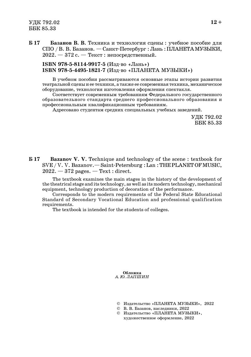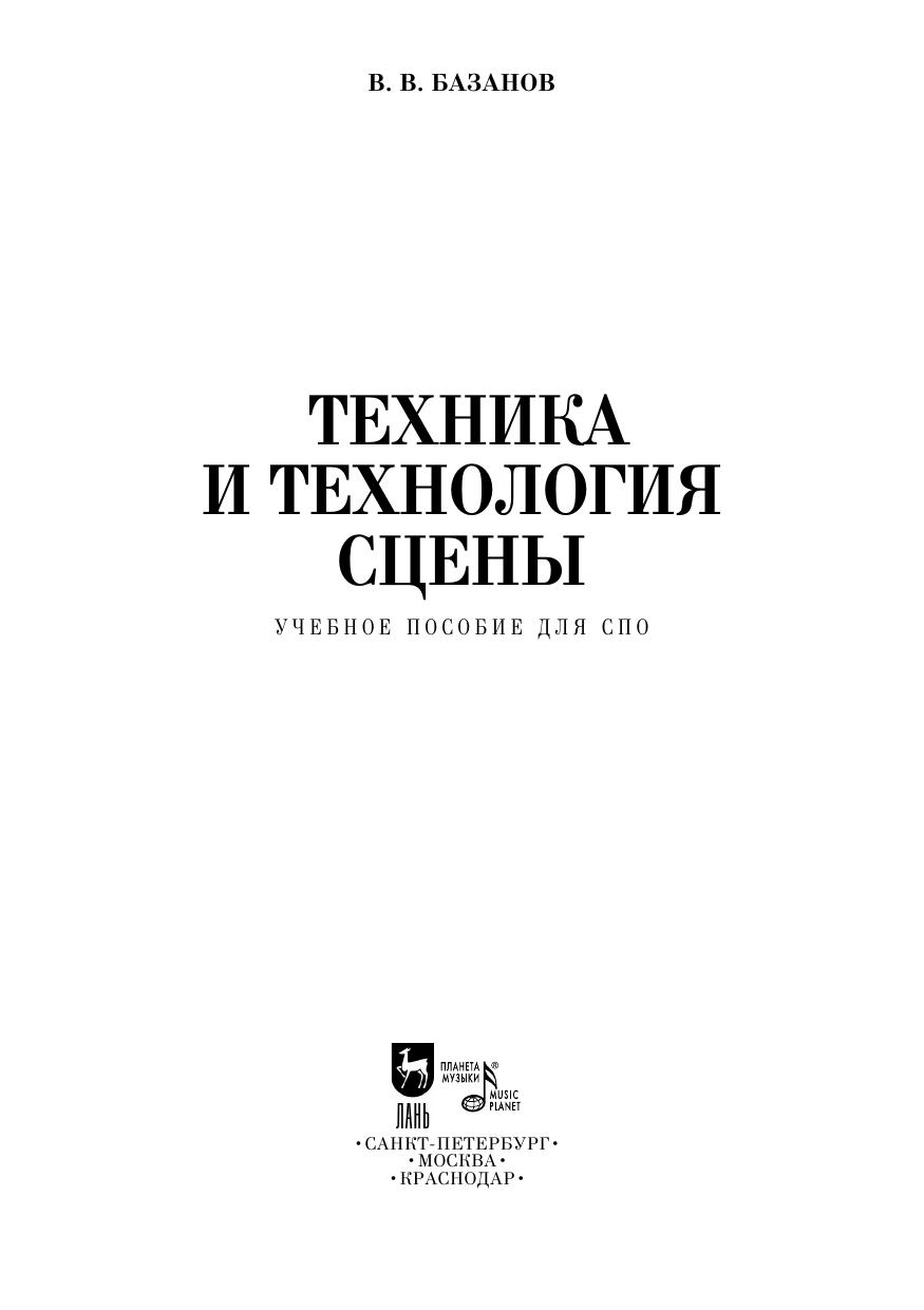 The textbook examines the main stages in the history of the development of the theatrical stage and its technology, as well as its modern technology, mechanical equipment, technology production of decoration of the performance.